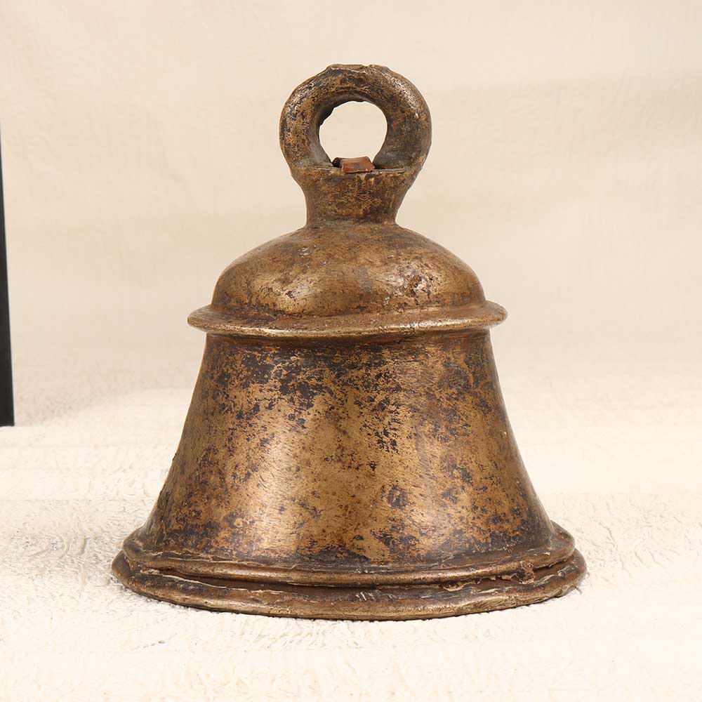 Step back in time with this vintage bell metal temple bell, handcrafted in the Himachal region of India. With its stately brown patina and understated design, this decorative accent lends an air of mysticism and intrigue. When you strike this temple bell, its rich hum will call you into a state of calm presence. Hang it in an entryway or sacred space to set the tone for reflection as you enter. Or, mount it near your meditation cushion or altar for use in rituals and ceremonies. As you focus on the slow, fading tones, you'll feel your busy mind settle into serenity. Bring a piece of Eastern spiritual tradition into your home with this vintage Indian temple bell. Let its soothing ring center your mind, uplift your spirit, and remind you of the sacred in everyday life. With each strike, enter a space of gratitude and grace.