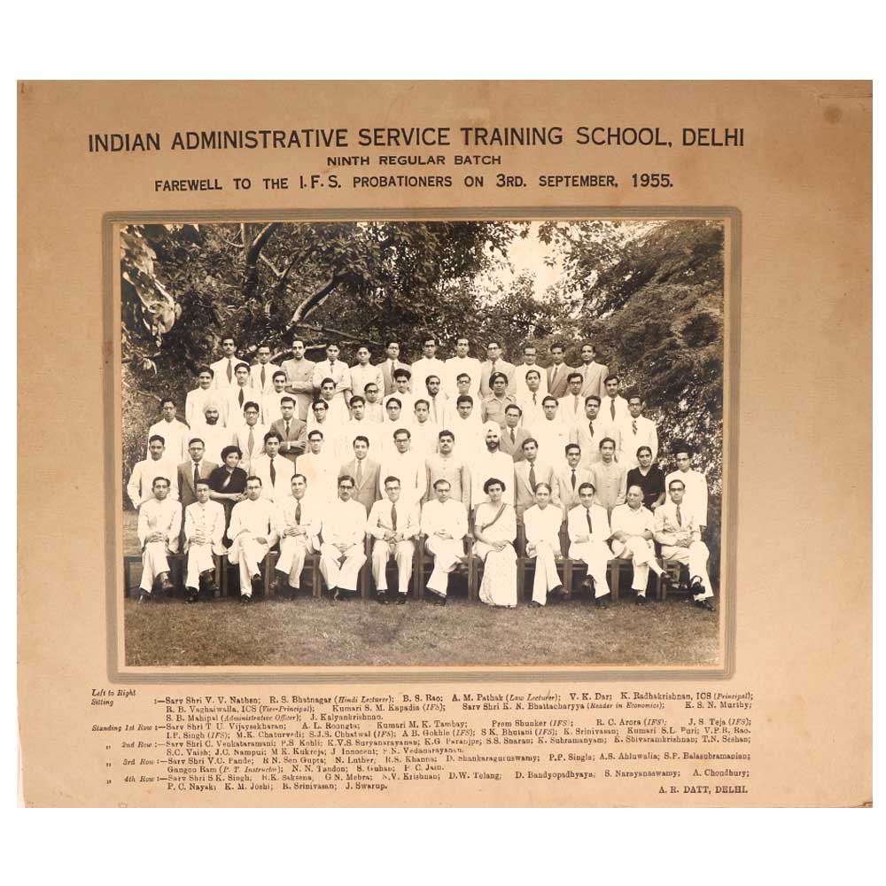 Step back in time and relive history with this stunning vintage photograph titled "Indian Administrative Service Training School, Delhi" capturing the Ninth Regular Batch's farewell to the Indian Foreign Service Probationers on September 3rd, 1955. This black and white print transports you to the era of India's independence and growth as a new nation. The crisp photograph features several smartly dressed young Indian civil servants assembled together, marking an important milestone in their journey to serve the country. This is a special memento for history aficionados, civil service aspirants, or anyone who wants a piece of India's heritage in their home. Displaying this photograph lets you highlight India's rich history and evolution. It also motivates young Indians to follow in the footsteps of the great leaders who shaped the nation. Key highlights include: