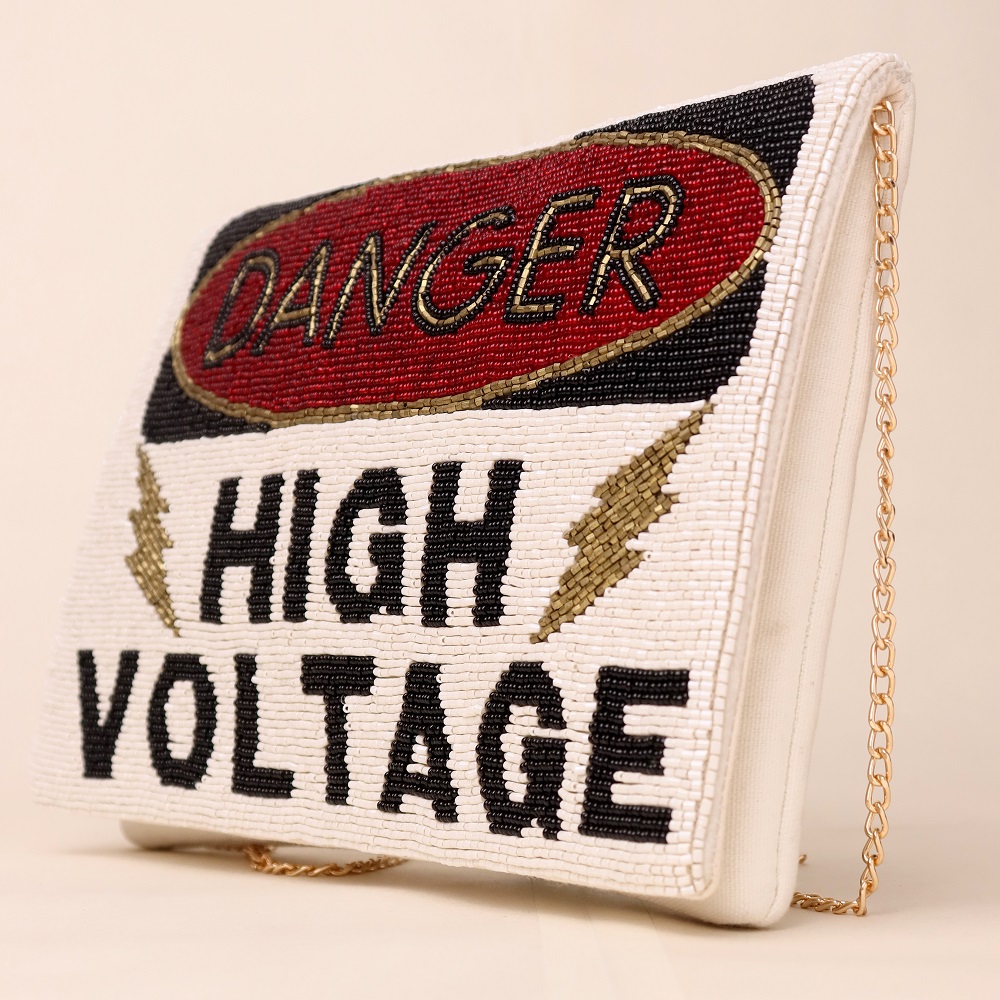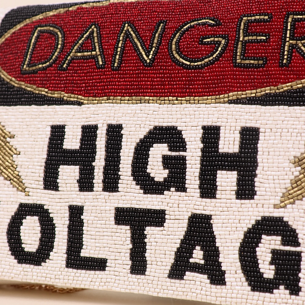 Make a bold statement with this electrifying hand-beaded clutch that screams attitude and style. Featuring a striking “DANGER HIGH VOLTAGE” motif crafted with meticulous beadwork, this clutch is designed for those who love to stand out. The sturdy build is balanced by a delicate gold-tone chain strap, offering both edge and elegance in one versatile accessory.