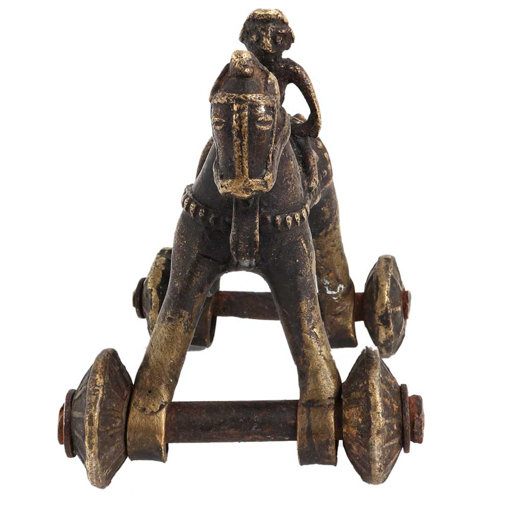 Highly Decorative Brass Rider On Horse With Wheels Temple Toy were roughly formed, rolling unevenly, but are nicely detailed figurine of a Toy Horse on wheel also know as pull Toy was used as a Toy and now used as a Collectors Office. Wedding gift, anniversary gift, souvenier,Home decoration and house warming gift.