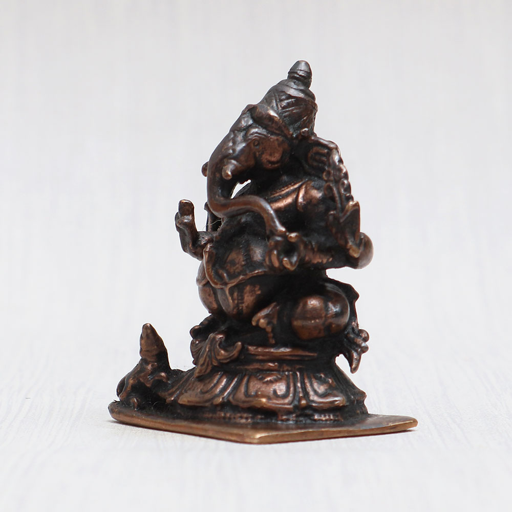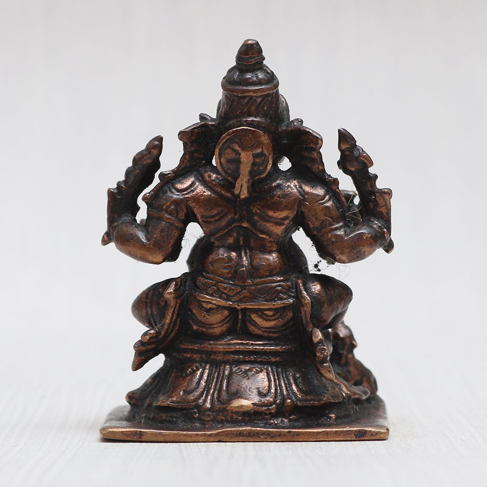 Embrace the divine aura of Lord Ganesha with this magnificent copper statue meticulously handcrafted by professional Indian artisans. Seated gracefully with his Vahana, the mushak, this Ganpati idol exudes a timeless vintage charm that elevates the ambiance of any prayer room at home, office, restaurant, cafe, or shop. Ideal for worship in temples or personal devotion, this Ganesh Ji murti showcases the perfect blend of artistry and spirituality. Its auspicious presence brings blessings and positivity to any space it graces. Moreover, it serves as a heart-warming gift for your loved ones on special, festive, or auspicious occasions. Whether adorning your sacred spaces or acting as a cherished token of love, this Ganesh murti is a symbol of divine grace and devotion. Additionally, it also makes an ideal Ganpati idol for your car, completing your journey with divine blessings.