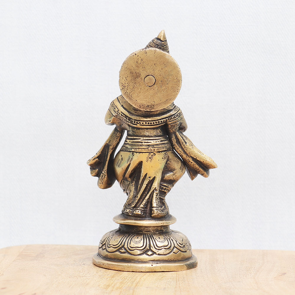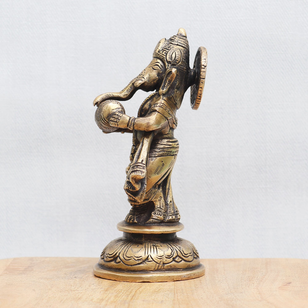 Buy a bronze statue of Lord Ganesha online from our website which is expertly crafted by skilled Indian artisans using high-quality bronze. This statue showcases Lord Ganesha playing an enchanting Indian musical instrument, capturing the essence of divine music and artistry. Handcrafted with meticulous attention to detail, the statue boasts intricate craftsmanship, resulting in a stunning antique finish. Perfect for decorating your home, office, restaurant, or hotel, this bronze idol is a symbol of reverence and spirituality. Its presence brings a sense of peace and harmony to any space. It also makes a remarkable addition to your vintage collection, museum, or exhibition, captivating the attention of art enthusiasts and connoisseurs. Whether it's for worship or as an auspicious gift, this bronze Lord Ganesha statue holds great significance. Embrace the divine blessings and present it to your family, friends, or relatives on special occasions or festive celebrations. Explore our exclusive collection of bronze Hindu god idols and discover the timeless beauty and spiritual aura of Lord Ganesha encapsulated in this remarkable piece of art.
