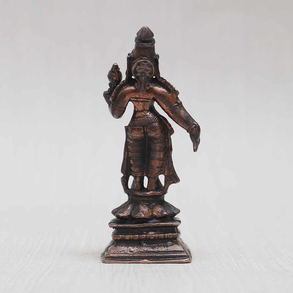 Buy a Hindu Goddess Maa Parvati Copper Statue that is a magnificent creation by highly skilled and experienced Indian artisans. Crafted from high-quality copper, this standing statue boasts a vintage-style finish, adding a touch of elegance to any space. The attention to detail is awe-inspiring, making it a captivating item for exhibition, decoration, or collection. Ideal for your prayer room at home, office, restaurant, cafe, or shop, this small god idol for the pooja room radiates spiritual energy. Its divine aura makes it the perfect centerpiece for worship in a temple. This statue is an excellent choice for your loved ones on special, festive, or auspicious occasions. You can now conveniently buy idols online and bring home this stunning copper Goddess Parvati statue.