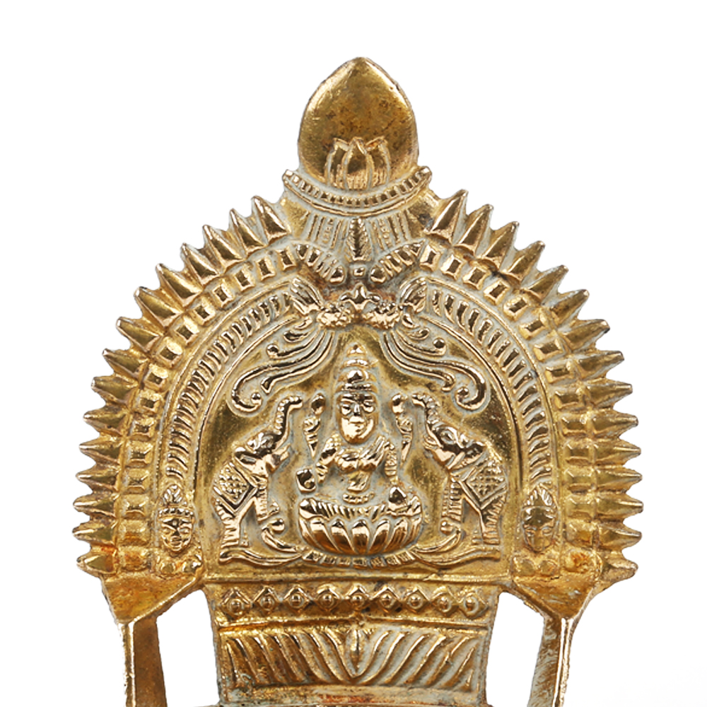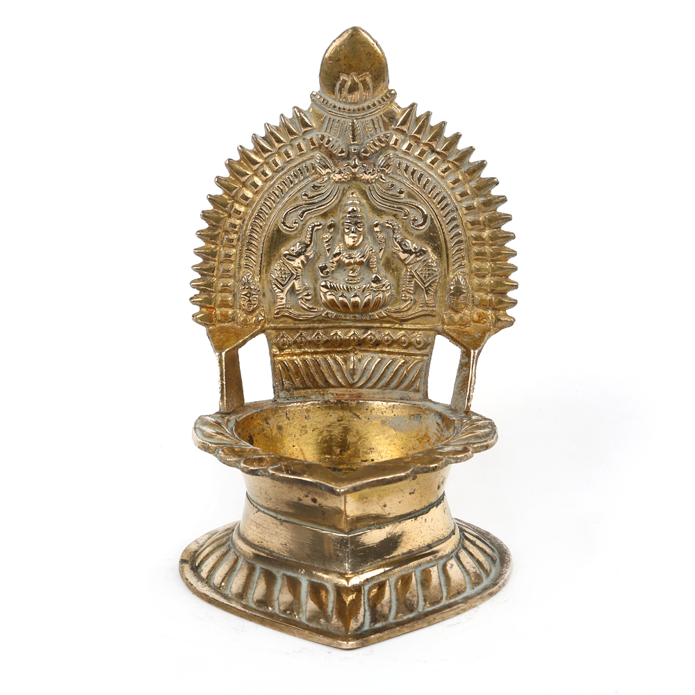 Hindu Ritual Oil Lamp with Deeplakshmi in Bronze. It is Made by Lost Wax Process. Adds Spiritual Flavor to Your Decor. Vegetable Oil, Mustard Oil or Desi Ghee can be Use to Light the Lamp with Cotton Wicks.