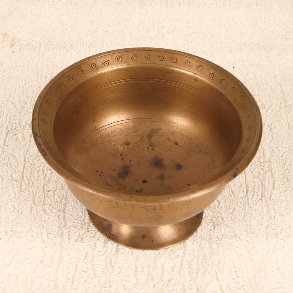 Mark your forehead with the blessings of the Gods with this bell metal holy kumkum cup. Handcrafted from solid bell metal, this vintage cup has a weighty, substantial feel and a heavenly ring when rung to sanctify prayer rituals. The wide, flared shape gives easy access to the vibrant red kumkum powder within, making it simple to adorn your forehead in preparation for puja. Each cup develops a storied patina from years of ceremonial use, lending an antique, heritage appearance that represents meaningful tradition. For devotees seeking a spiritual tool to enrich their practice, this resonant kumkum cup makes a soulful addition to the home shrine. Use its melodic ring to focus your mind, summon the Gods, and connect more deeply with the divine before each prayer.