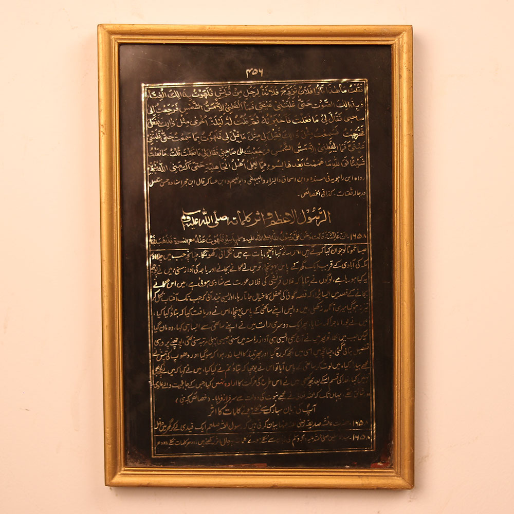 - Handcrafted glass monument featuring sacred Islamic calligraphy and symbols