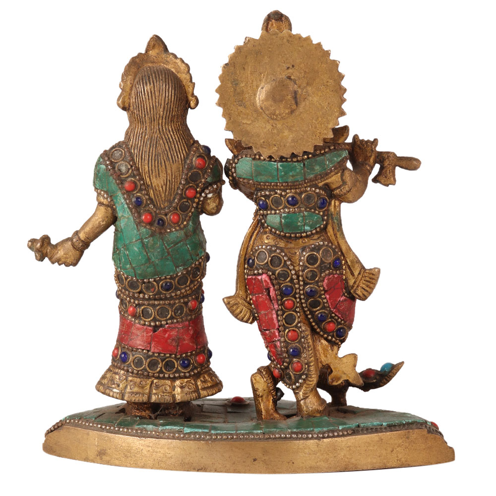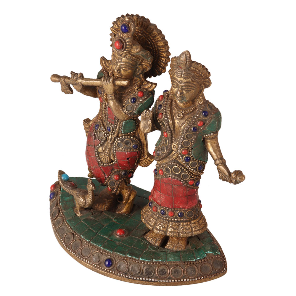 A holy standing statue of Lord Krishna and Goddess Radha is carved from brass metal alloy. It is engraved with beautiful coloured stones. A peacock can be seen near the foot of Lord Krishna. Sri Krishna's right leg is crossed facing his left leg. He is playing flute on this figure. Goddess Sita is holding a lotus in her left hand. The statue is colourful and attractive. Place the statue in your temple. You can also display it in your vintage collection. Give it as a gift to your loved ones.