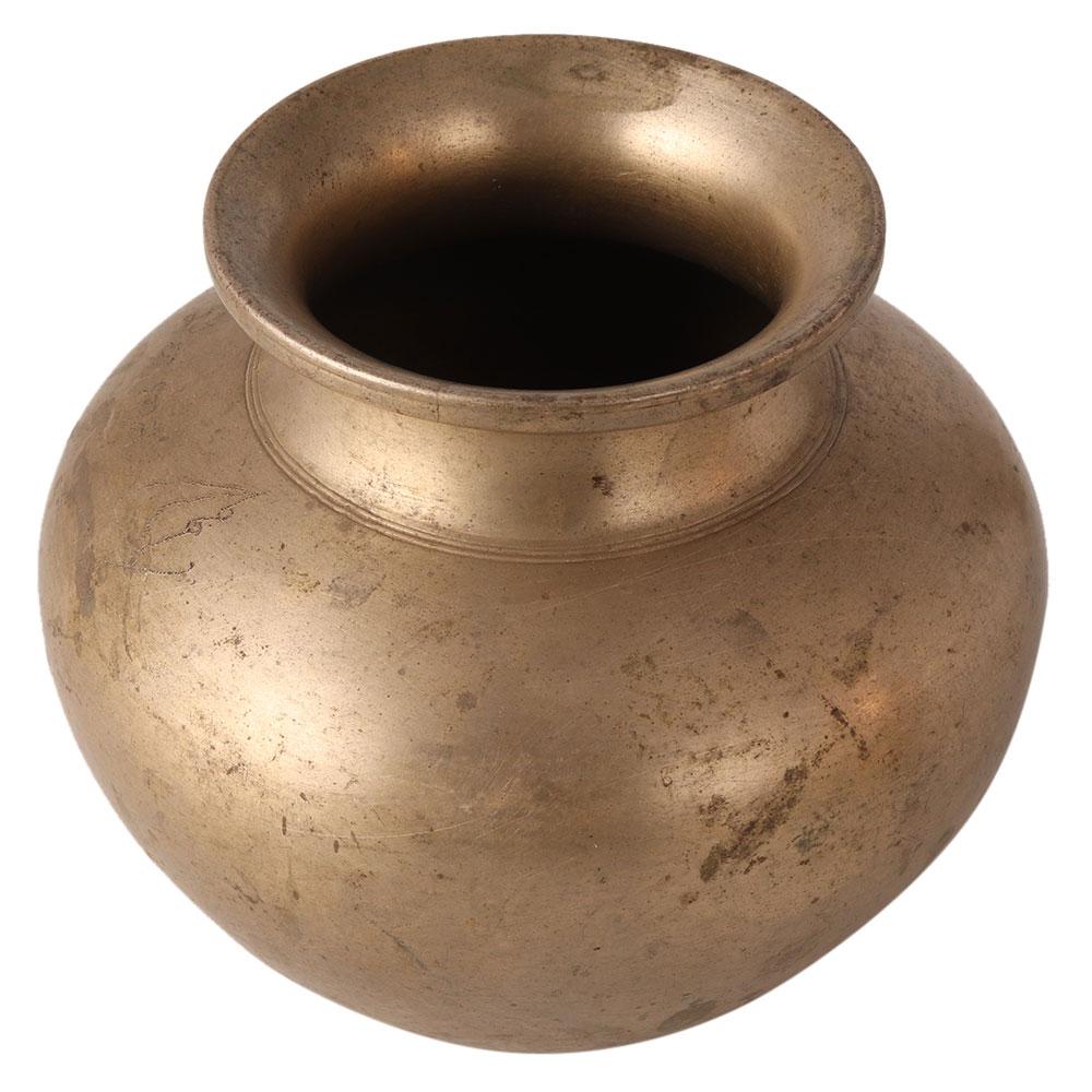 Holy water pot made of a Bell metal alloy. This pot is carved in the mountains of Himachal. It has a simple shape and is bronze in colour. It can be used as a display piece or for ritual worship of an idol.