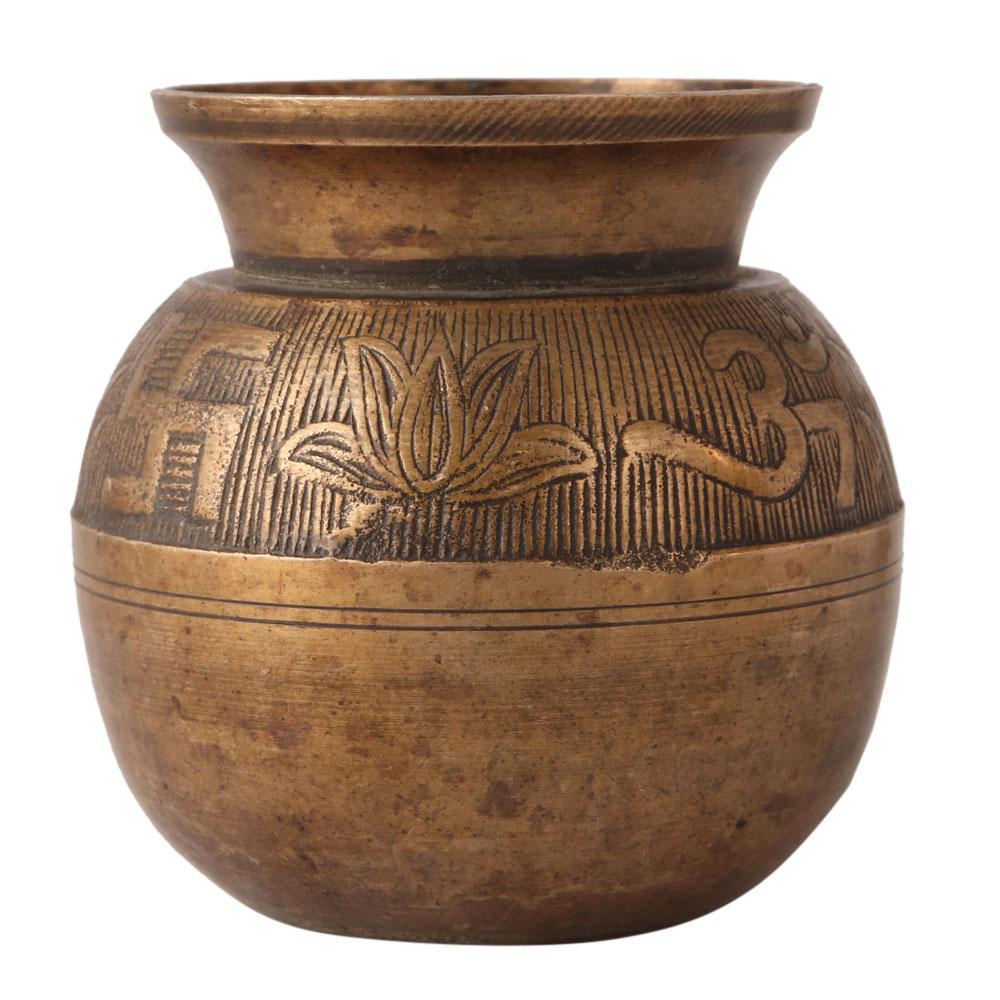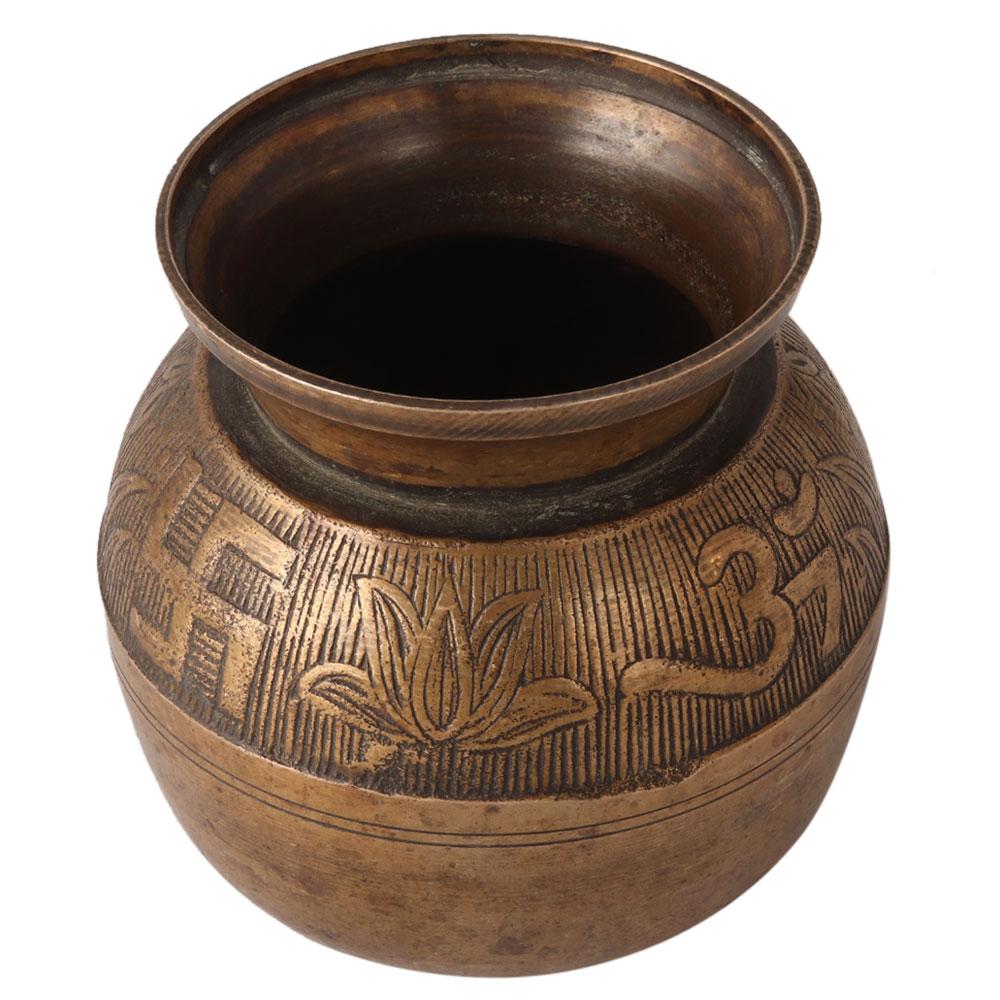 A beautifully crafted Holy Water Pot made of Brass. It has 'Om' and 'Swastik' symbol beautifully crafted on the sides with a flower between them.