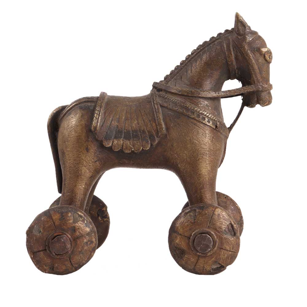 This is an ancient Hindu handcrafted brass horse temple toy with wheels made by skilled artisans. "Temple toys" were symbolic offerings left in Hindu temples. These smaller items, which were frequently shaped as horses, camels, elephants, and carriages, were meant to represent their larger counterparts. Use it yourself or give it to someone you care about.