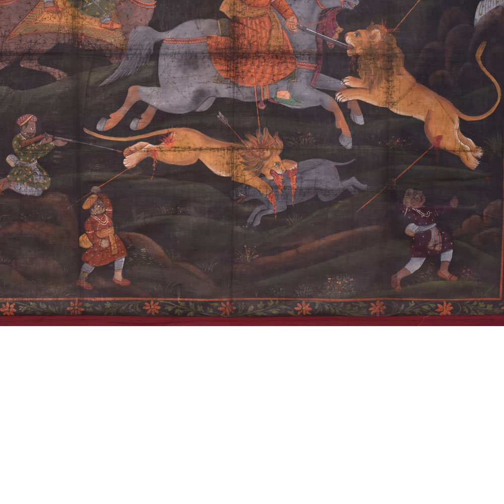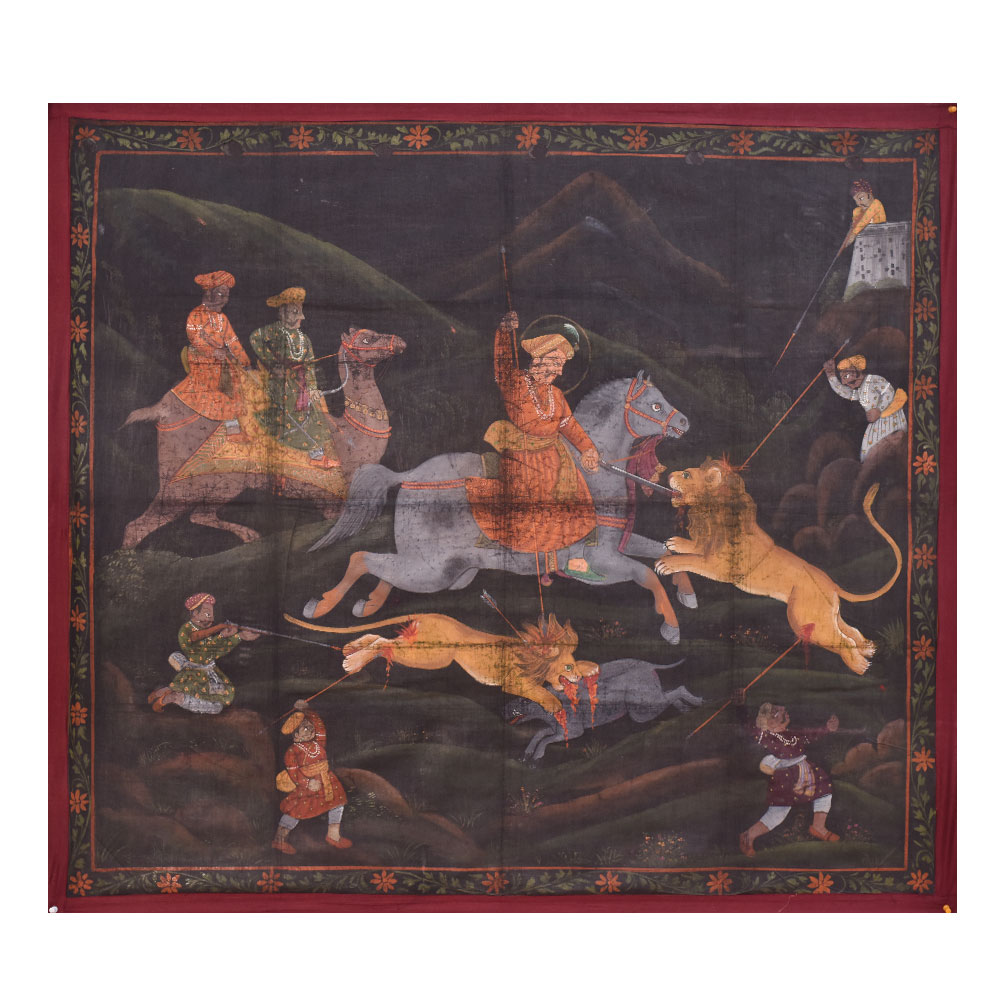 A beautiful Pichwai painting on fabric cloth that is a stunning representation of a regal king embarking on a daring hunt. At the center of the painting, we see the king wielding a sword as he charges towards a ferocious lion, ready to take it down. Behind him, two men ride on a camel, adding to the royal and majestic vibe of the piece. On the right-hand side of the painting, we see three hunters taking down another lion, showcasing the bravery and strength of the king's entourage. The painting has a dark background, which accentuates the bright colours of the main figures, making them truly stand out. The intricate floral borders framing the painting add a touch of elegance and sophistication, giving it an almost royal aura. The painting is expertly painted by professional Indian artists, using a mix of vibrant colours to create a mesmerizing effect. It is a true masterpiece that can be hung in any living room, bringing a touch of Indian culture and tradition to the space. This painting makes an incredible gift for family, friends, or relatives, particularly for special or festive occasions, as it is sure to impress anyone who lays their eyes on it.