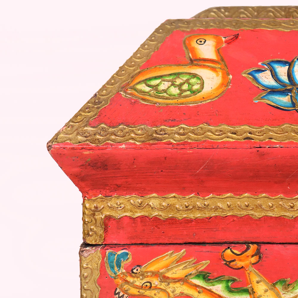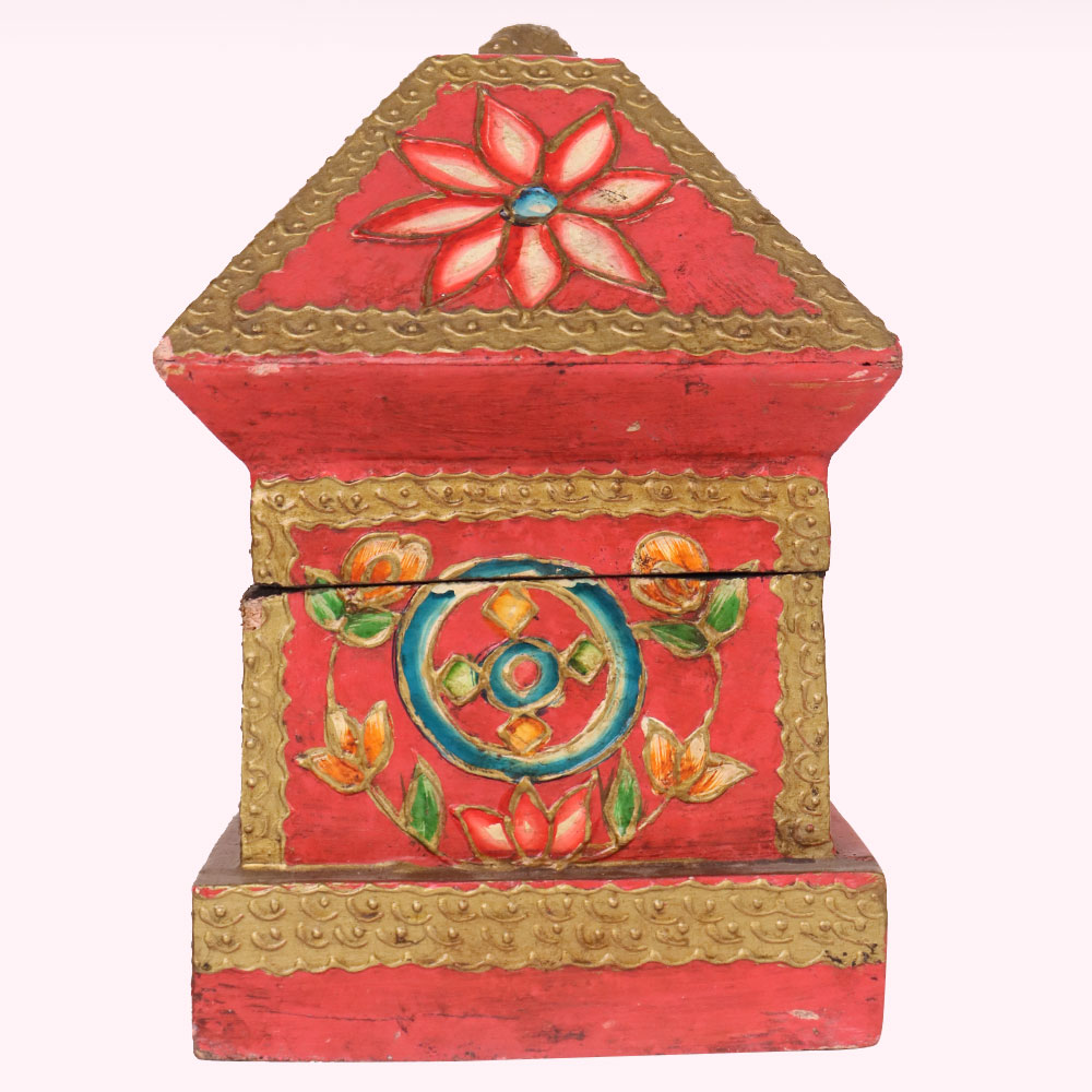 An Exquisite Hut-Shaped Wooden Box that is a harmonious blend of functionality and aesthetic appeal. Crafted with precision and care by talented Indian artisans, this charming box serves as an ideal storage solution for your jewelry and small treasures, seamlessly merging practicality with timeless design. The box features a captivating multi-colour finish that adds vibrancy to any space, making it a versatile choice for home, office, cafe, restaurant, or hotel decor. Its unique hut shape lends a touch of rustic elegance, creating a warm and inviting atmosphere. The intricate engravings of a dragon, bird, and flowers showcase the artisanal craftsmanship, transforming this box into a true work of art. This wooden masterpiece is not just a storage solution, it's a conversation starter. Ideal for display in various settings, from your living room to a gallery exhibition, it effortlessly enhances any environment. Whether you're seeking a distinctive decoration or a thoughtful gift, this box is perfect for special, festive, or auspicious occasions.