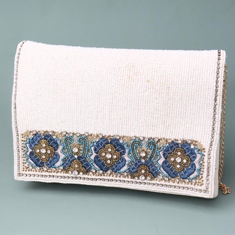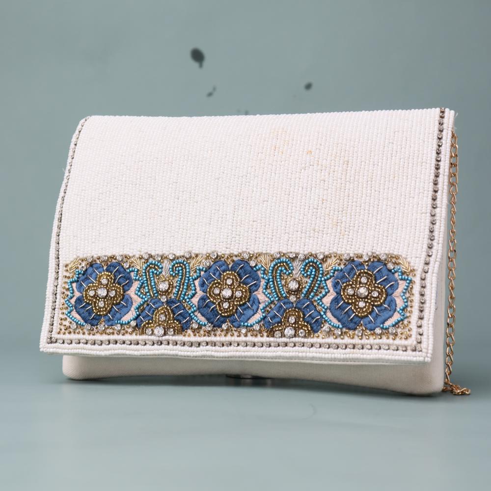 Make a statement of refined elegance with the Imperial Bloom Hand-Beaded Clutch. Adorned with an exquisite floral border design, this handcrafted piece exudes timeless charm and artisanal precision. The rich beadwork in contrasting hues adds a regal touch to the structured silhouette, making it an ideal accessory for weddings, evening galas, and festive occasions. With its sleek chain strap, this clutch offers the perfect blend of beauty and practicality.