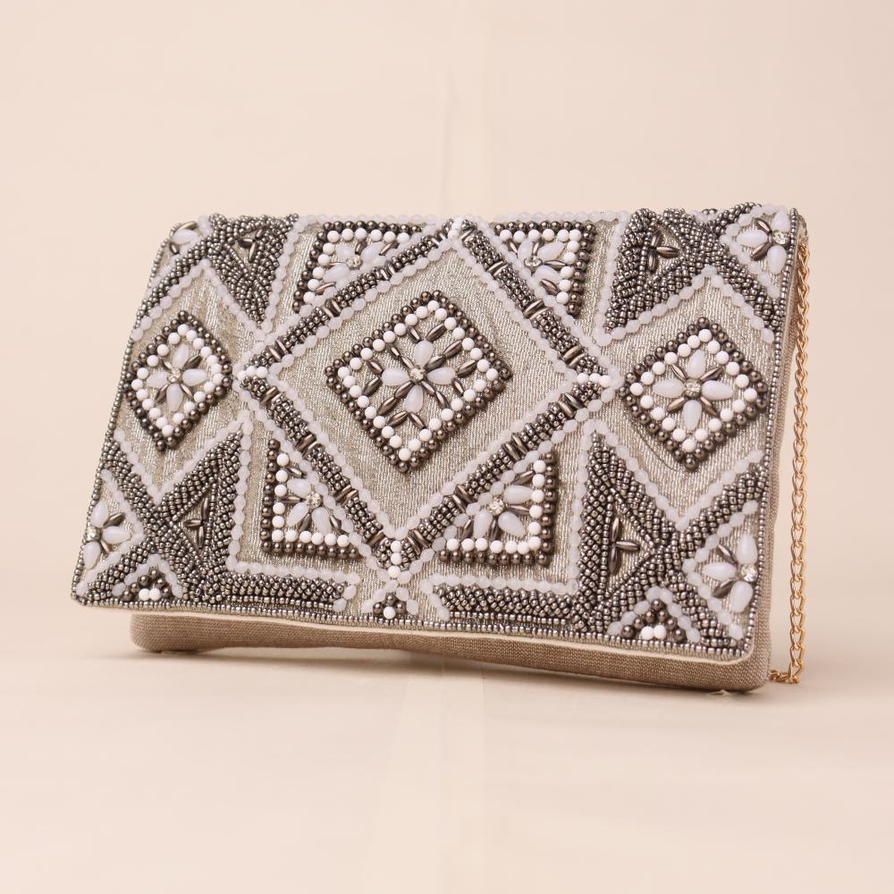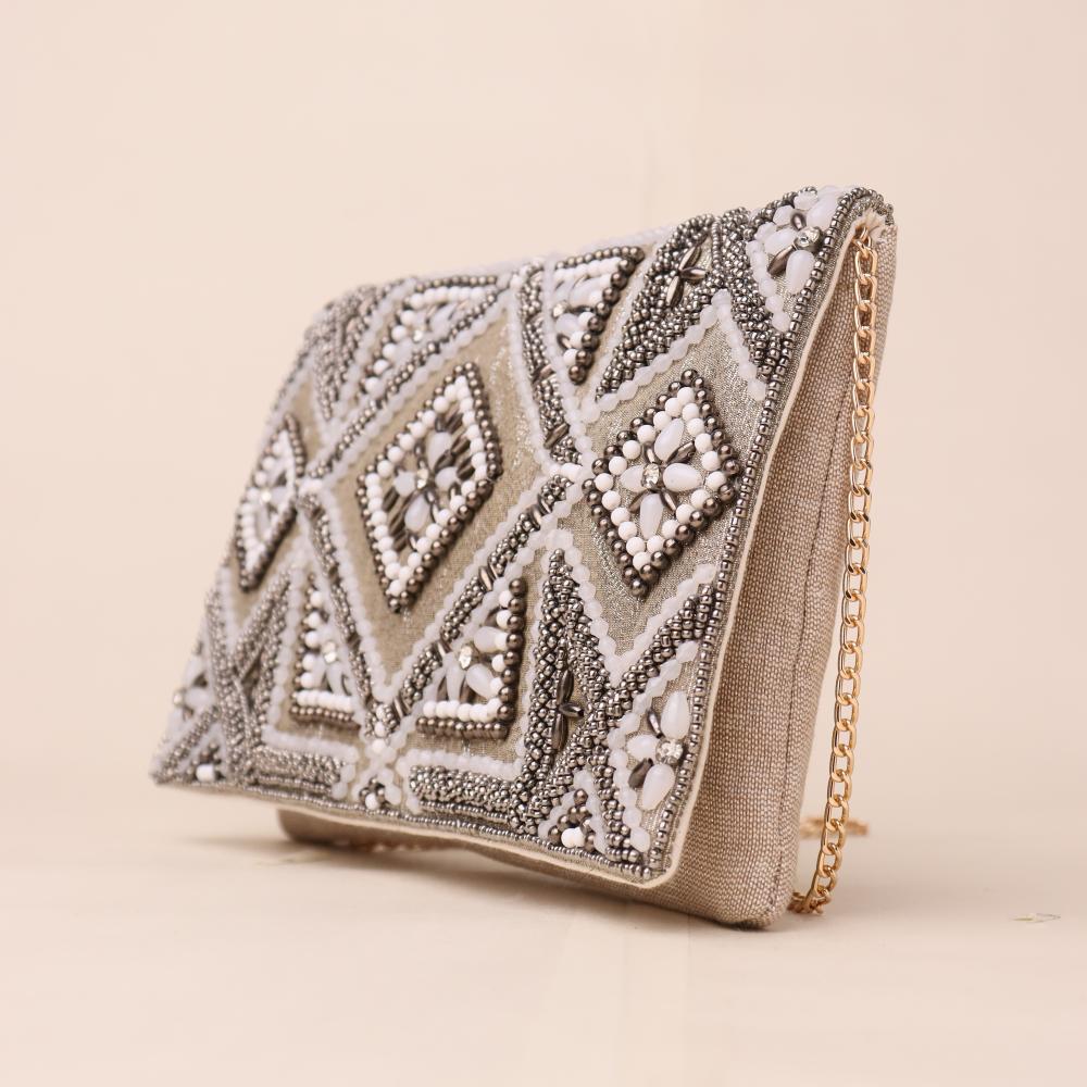 Elegant and ornate, this clutch embodies timeless glamour with its intricate hand-beaded design and regal diamond motifs. Designed to elevate your look for weddings, receptions, or formal soirées, it features meticulous detailing that adds a luxurious texture and shimmer. Includes a sleek gold-tone chain strap for convenient shoulder carry, allowing you to switch from handheld to hands-free with ease.
