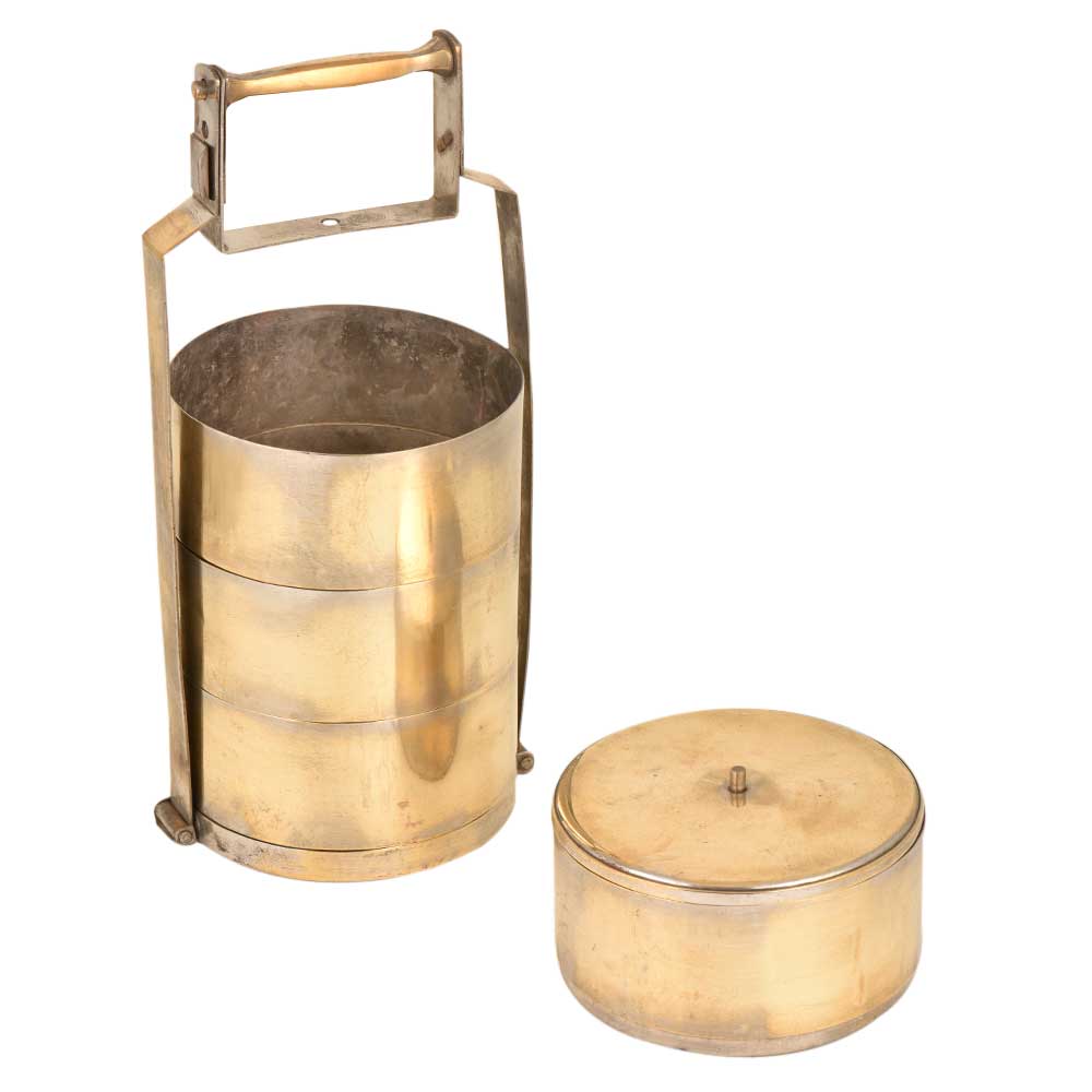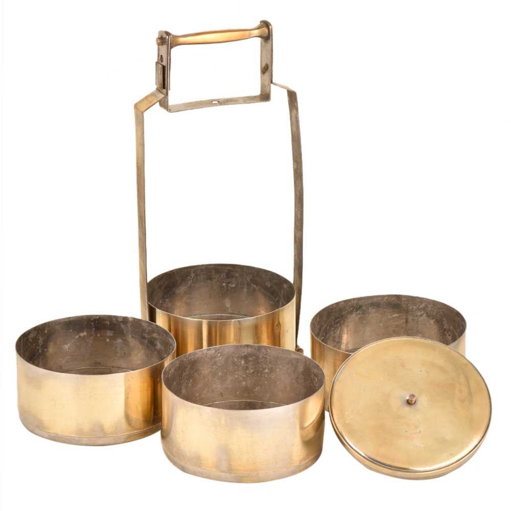 This is an old brass lunch box with four containers. The brass lunch boxes were very popular and are now used as table ornaments, jewelry storage or presentation of food .The boxes were are engraved with the names of the owner so that it could not be misplaced.