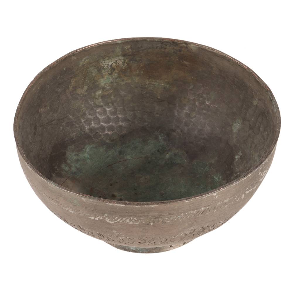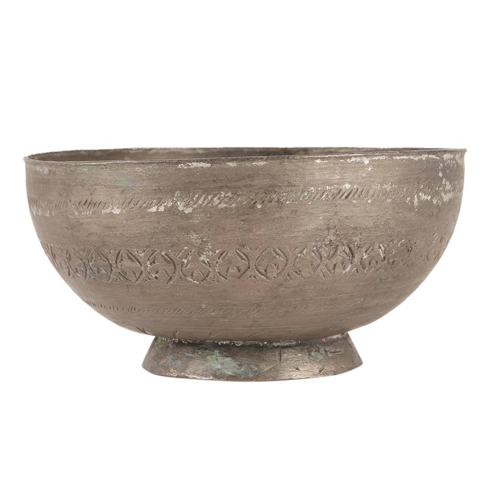 This antique looking brass-footed bowl is a work of folk art created by artists. This islamic style bowl is carved with delicate carvings and a beaded border. Its vintage appearance makes it a great gift or piece of home décor. It comes with a dark patina finish.Â