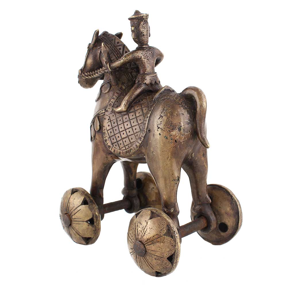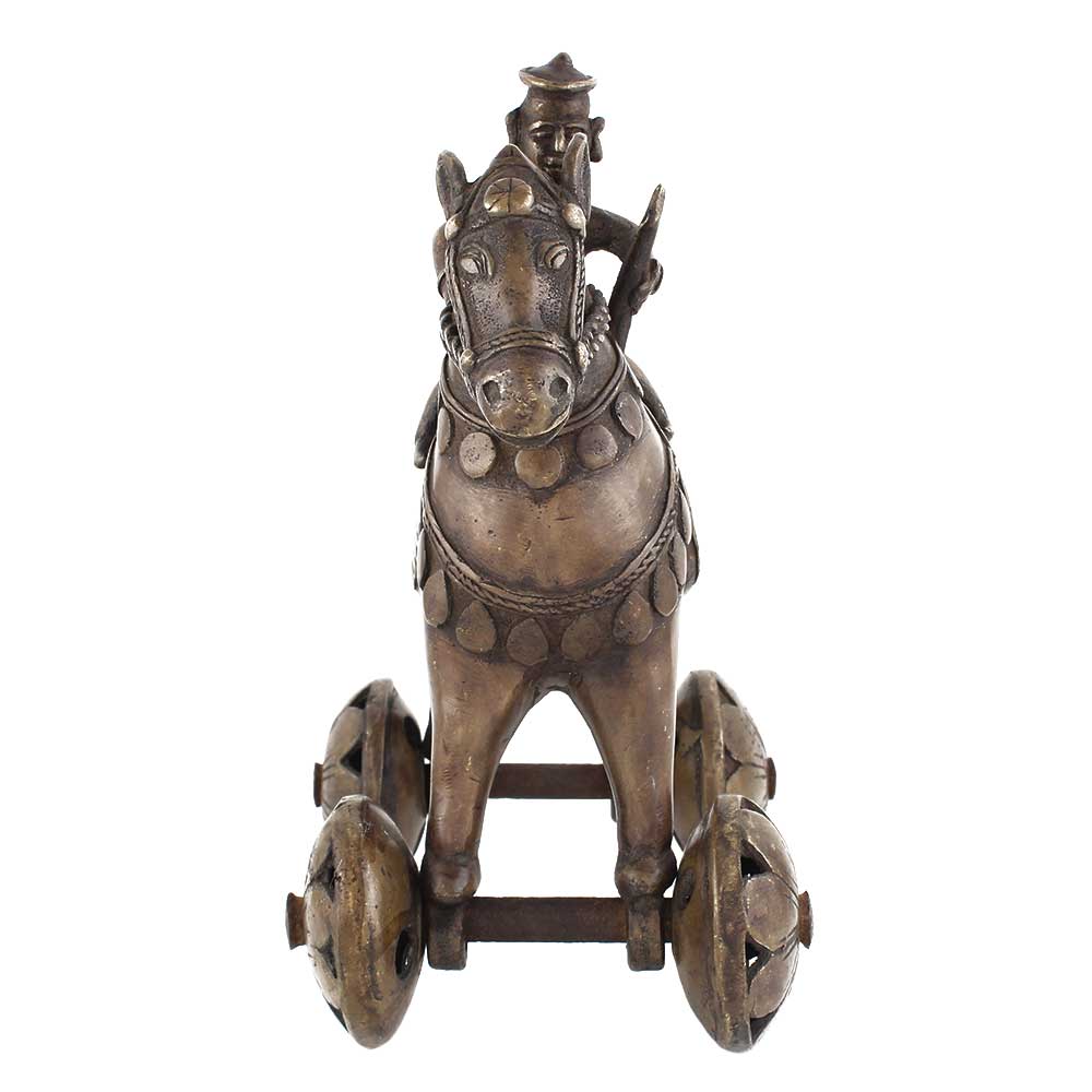A brass temple toy in the style of a rider wearing a towering turban on the back of a Horse with decorative features with the animal's legs resting on circular wheels.