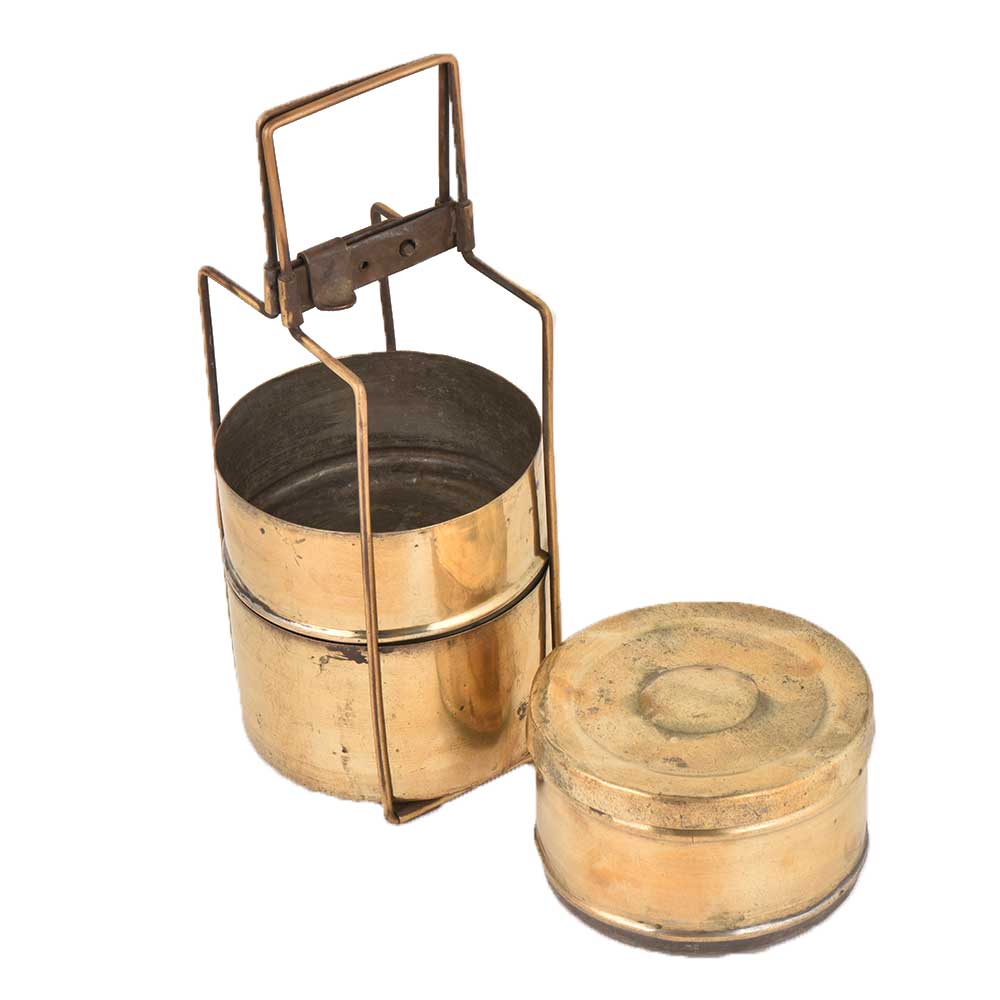 A lovely brass Tiffin box has three carriers held together with a brass strap frame in square shape. The bottom container is slightly bigger than the other two. It has a single lid that is place on the top container when all the containers are place one above the other . Great gift for your loved ones.