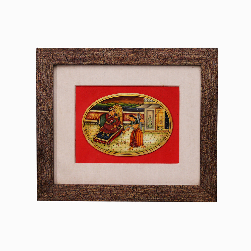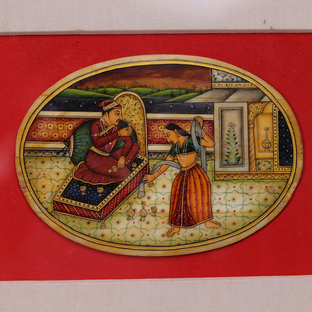 Immerse yourself in the rich, captivating world of traditional Indian art with this stunning painting on a camel bone plate. Showcasing the iconic motifs and techniques of the revered Mughal era, this piece is a true testament to the enduring legacy of India's cultural heritage. From the ornate designs to the elegant geometric patterns, every element of this painting has been meticulously rendered to capture the essence of India's artistic mastery. Lose yourself in the mesmerizing interplay of colors and shapes that dance across the surface, transporting you to the opulent courts of ancient India. Whether you're a seasoned collector or simply seeking to infuse your home with a touch of global elegance, this Indian art painting on camel bone is a must-have. It's a stunning centerpiece that will ignite the imagination, spark meaningful discussions, and elevate the ambiance of any room with its timeless beauty and cultural significance.