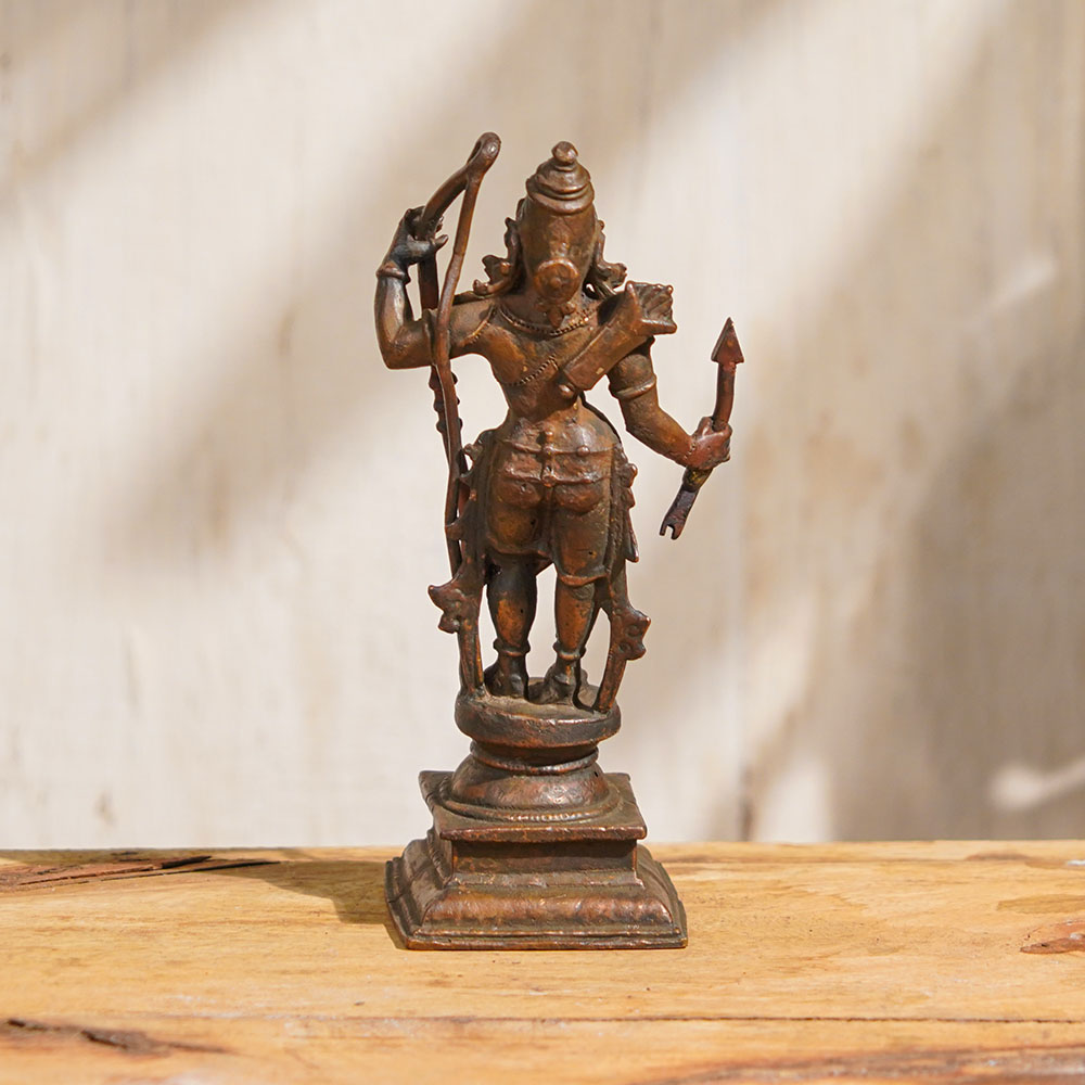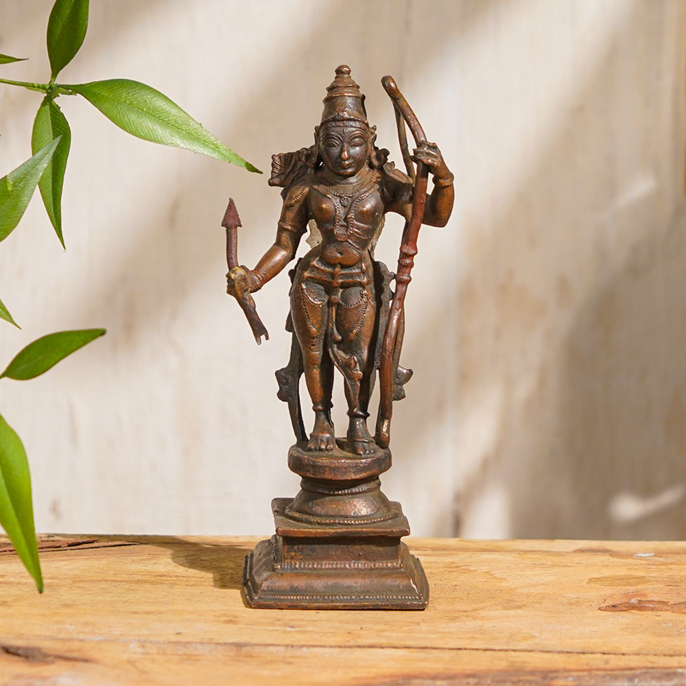 Buy this Copper Lord Ram Murti online and embrace the divine presence of Lord Ram in your life. This stunning statue of Lord Ram, meticulously handcrafted by skilled Indian artisans, is a testament to the divine grace and beauty of the revered Hindu god. Made of high-quality copper, this Lord Ram Murti is not only sturdy and durable, but also adorned with intricate details that capture the essence of Lord Ram's divine attributes. Lord Ram, the seventh incarnation of Lord Vishnu, is worshipped in most of the Indian temples as a symbol of righteousness, courage, and devotion. This exquisite copper idol of Lord Ram is a perfect addition to your home or temple, adding a touch of spirituality and reverence to your space. This Lord Ram statue is not only a sacred symbol for worship, but also an auspicious gift for your near and dear ones on special occasions. Its exquisite craftsmanship and spiritual significance make it a cherished and meaningful gift that can bring blessings of prosperity, happiness, and protection.