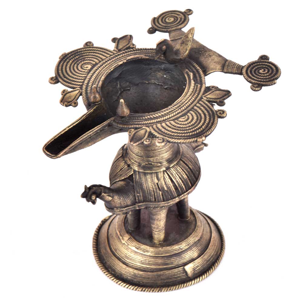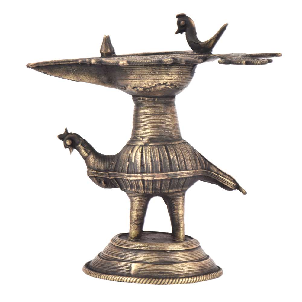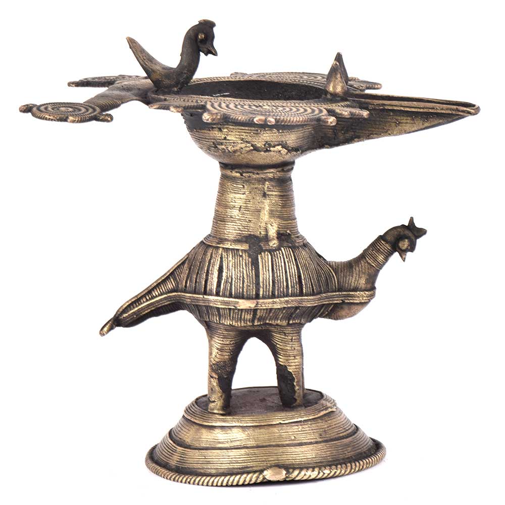 Handcrafted using old lost wax technique primarily practiced in Orrisa and West Bengals by the local or tribal artisans. In this technique the molten wax is poured into desired clay mould and when the wax melts the clay is broken and we get the desired metal object which is further polished to perfection. The Deep Cup Can Be Filled with Oil and Light a Cotton Wick. Diyas/ Oil Lamps are Considered Auspicious as in Hindu Religion. It is detailed with Elephant and Peacock Animals with Beautiful Details.