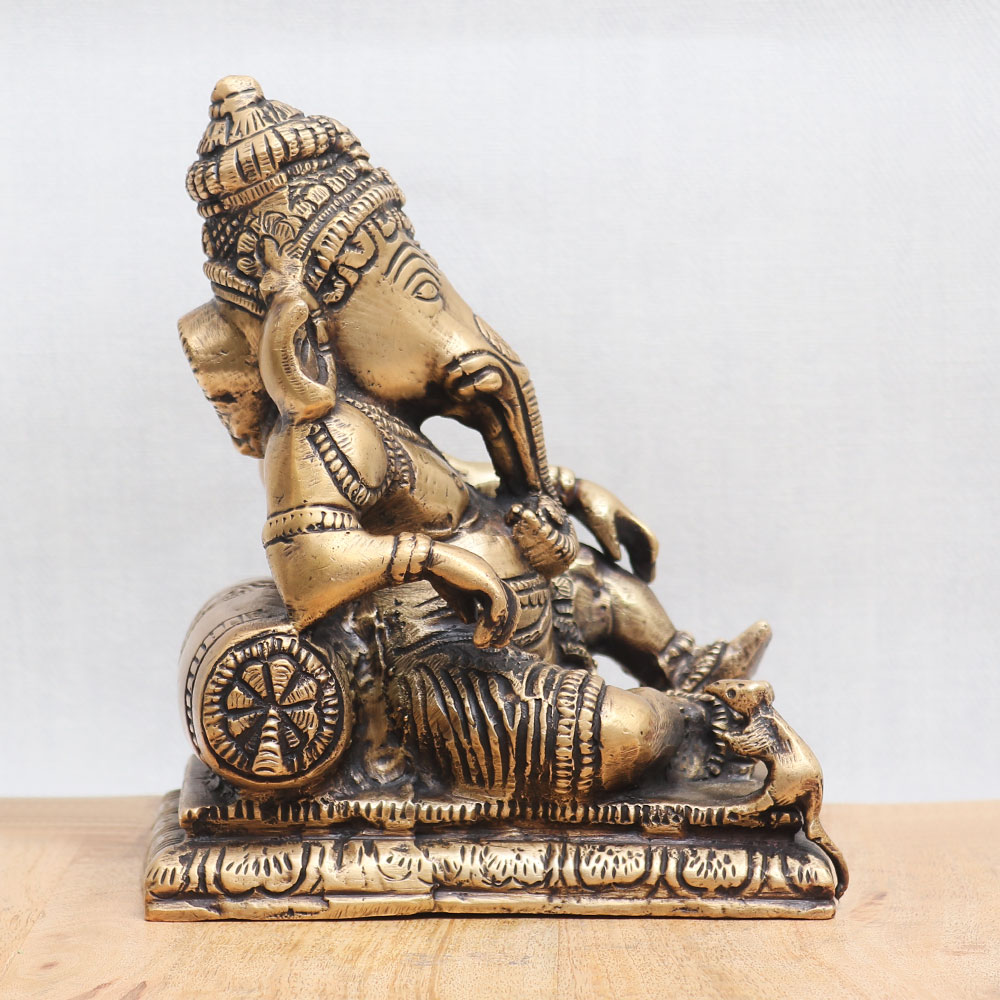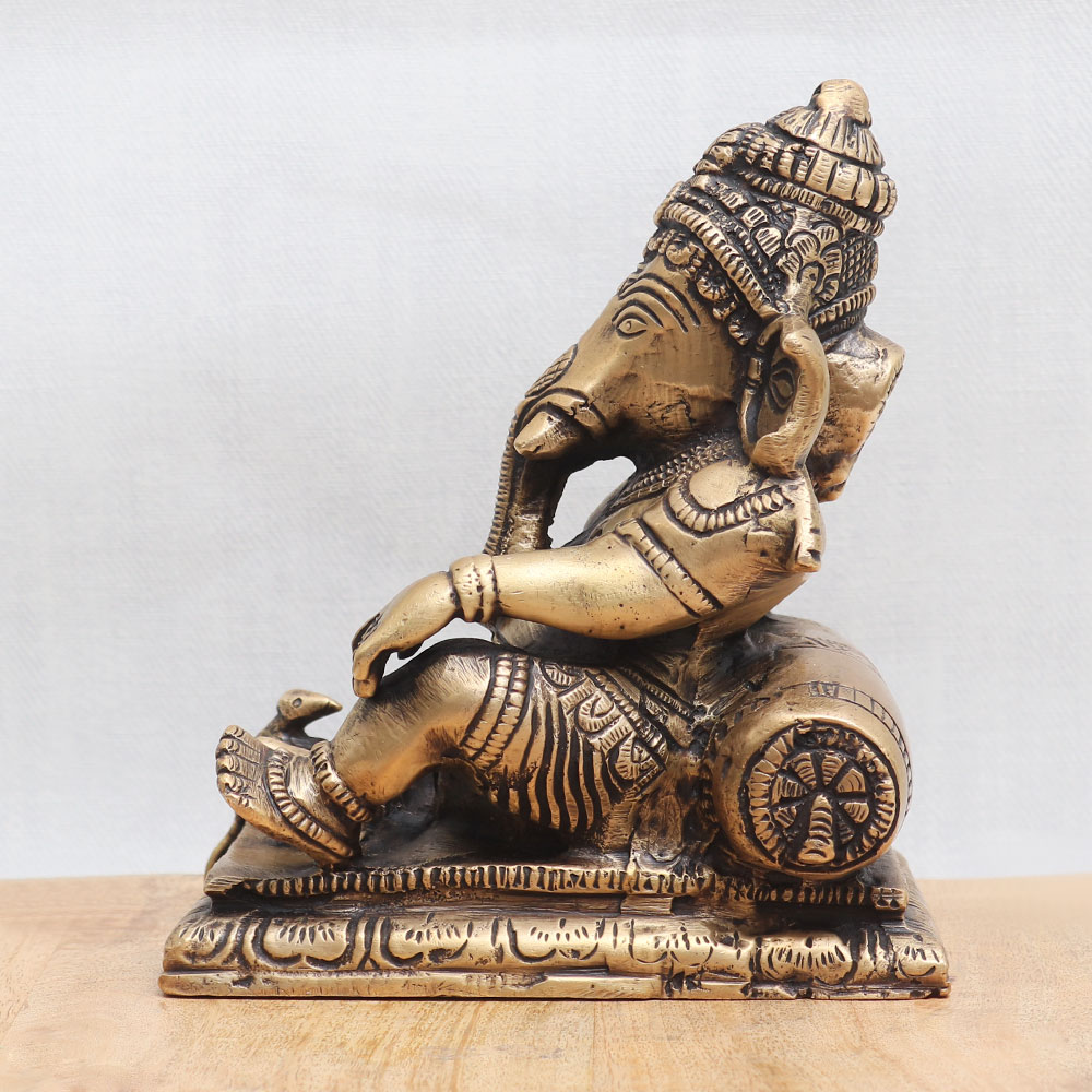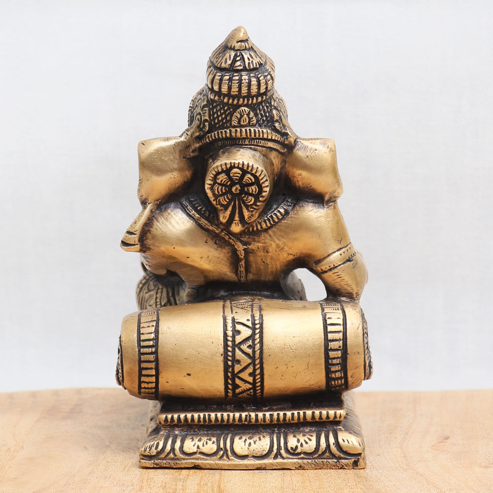 This statue depicts Lord Ganesha sitting gracefully accompanied by his loyal vahana, Mushak. This divine sculpture is crafted from high-quality bronze by highly skilled Indian artisans, ensuring exceptional craftsmanship and attention to detail. The handmade creation showcases intricate carvings and embellishments, exuding an antique finish that adds a touch of elegance and charm. Ideal for various settings, this enchanting statue can be proudly placed in your home, office, or restaurant temple, serving as a focal point for worship and decoration. It seamlessly blends spirituality and artistry, making it a captivating addition to any space. Additionally, this remarkable collectible is perfect for vintage enthusiasts and can be proudly displayed in a museum or exhibition. Apart from its symbolic significance, this statue also doubles as a striking decorative piece, instantly enhancing the ambiance with its divine aura. Moreover, it makes for an auspicious gift for your loved ones during special occasions or festivals, symbolizing blessings, prosperity, and good fortune. To experience the divine presence of Lord Ganesha and explore an extensive collection of such exquisite sculptures, browse our website and buy sculptures online with hassle-free delivery.