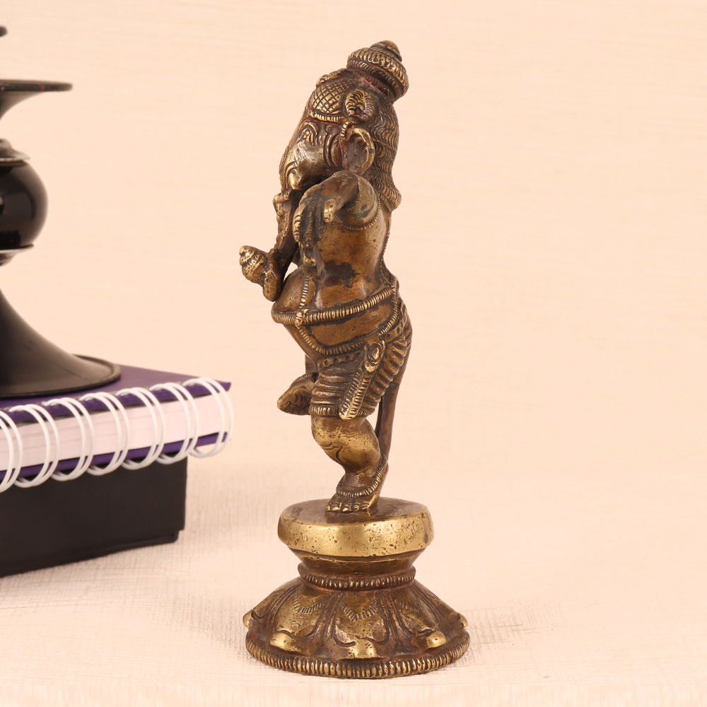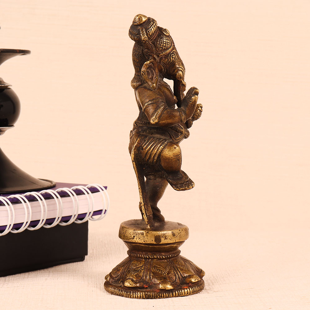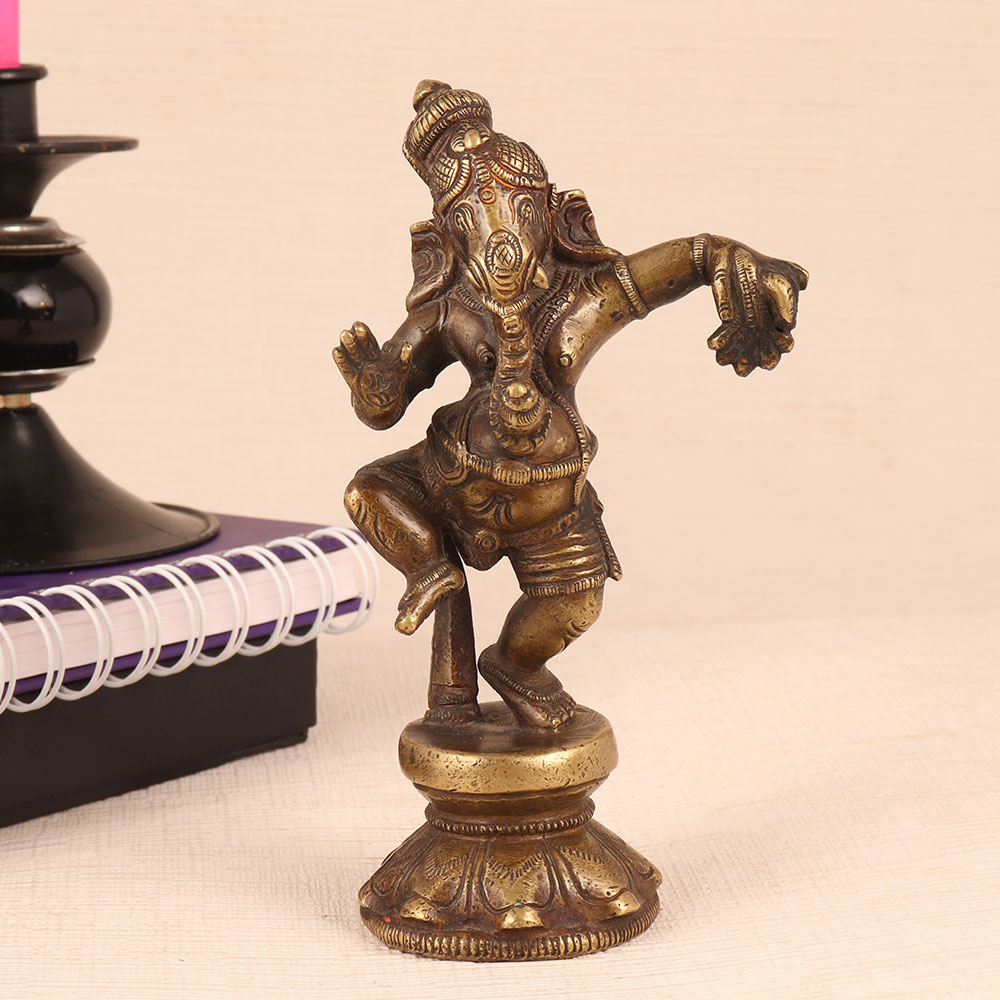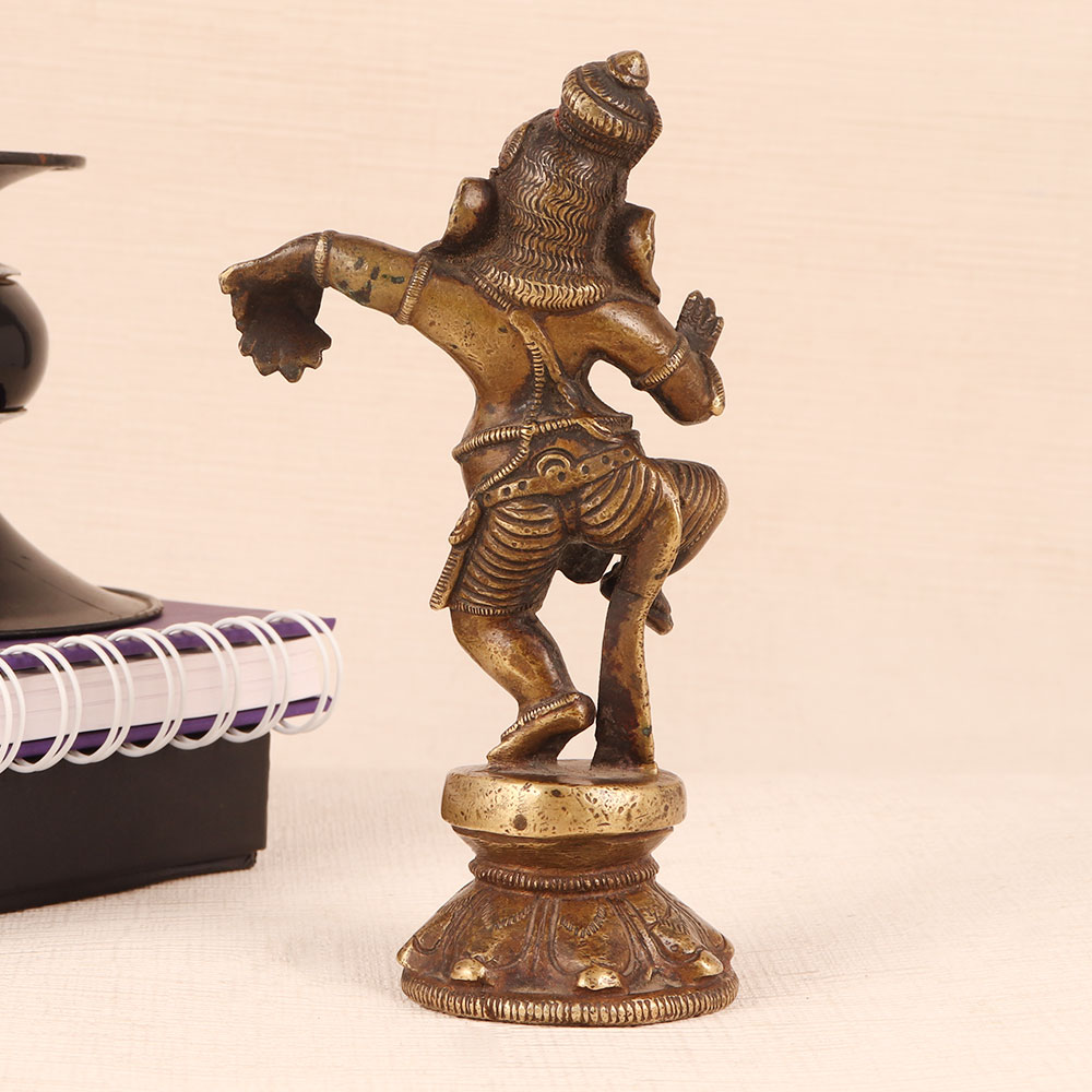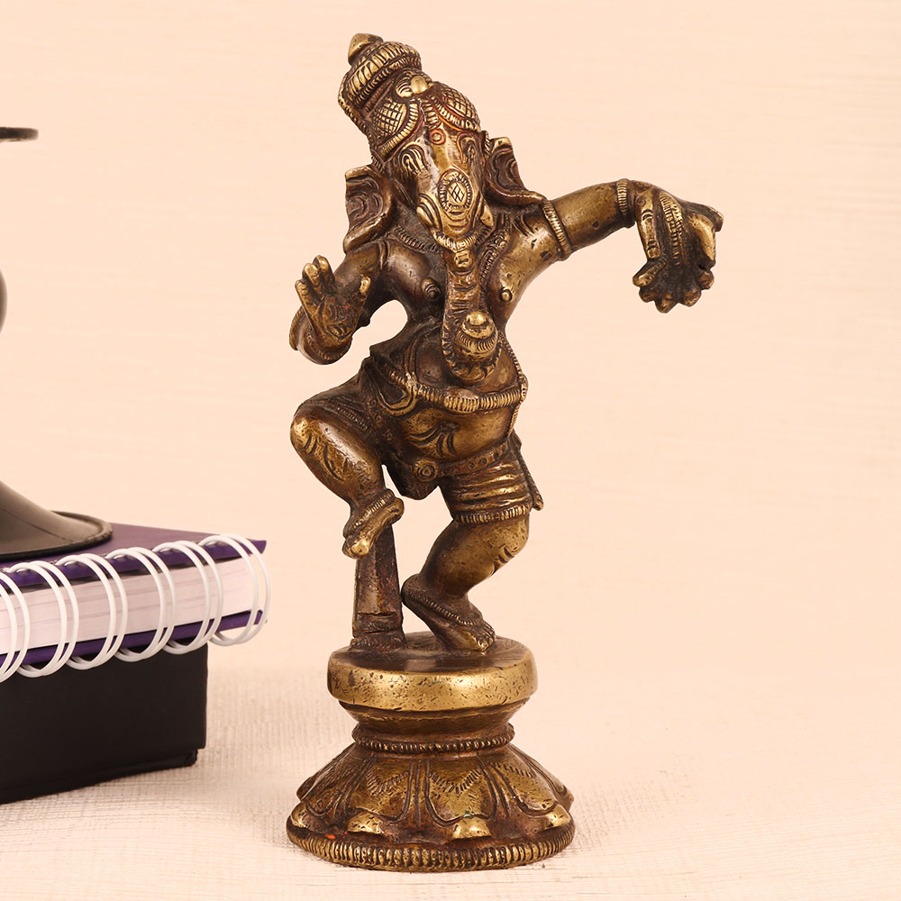 Enhance your spiritual and aesthetic senses with this vintage brass statue of Lord Ganesha, delicately crafted by professional Indian craftsmen from the renowned Himalayan Art tradition. This captivating masterpiece captures Lord Ganesha in a vibrant and dynamic dance, poised upon an antique brown-finished platform, radiating an aura of timeless elegance. Lord Ganesha, revered as the remover of obstacles and the patron of arts and intellect, symbolizes prosperity and divine blessings. This intricately designed statue embodies his grace, power, and charisma, making it a harmonious addition to your home, office, restaurant, hotel, cafe, or shop prayer room. Whether for worship or decoration, this statue adds an element of reverence and cultural richness to any space. For collectors of vintage treasures, it's a gem that adds character and history to your collection. As a thoughtful gift, it carries blessings and well-wishes, making it the perfect choice for special, festive, or auspicious occasions.