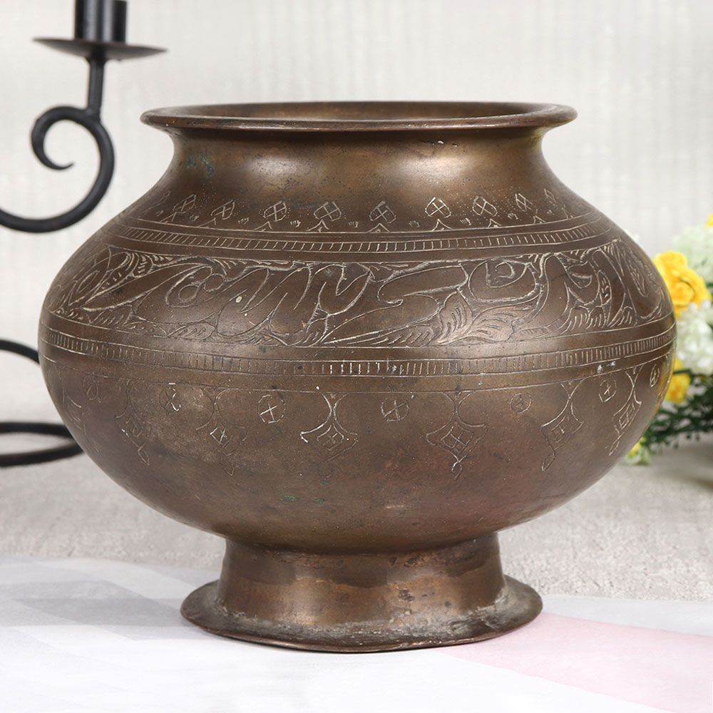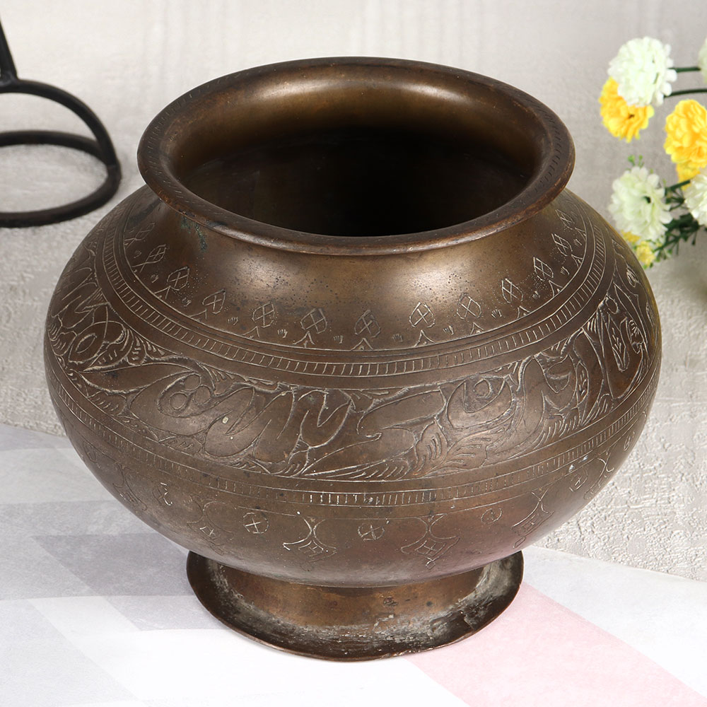 Transform your space with the timeless charm of our Vintage Brass Cooking Pot, artfully converted into a stunning flower pot. This piece boasts intricate engravings that tell tales of a bygone era, creating a captivating blend of history and nature. Handcrafted by highly skilled and experienced Indian artisans, each pot is a testament to their craftsmanship that is meticulously crafted from high-quality brass. The antique brown finish lends an air of authenticity, making it a striking addition to any environment. Versatile in use, it complements homes, offices, restaurants, hotels, cafes, and shops, instantly elevating the ambiance. Whether gracing your vintage collection or commanding attention at an exhibition, this pot is a conversation starter. Looking for a thoughtful gift? Our vintage brass flower pot is a perfect choice for your family, friends or relatives on special, festive, or auspicious occasions. Its enduring beauty and cultural significance make it a cherished present that symbolizes both tradition and the beauty of nature.