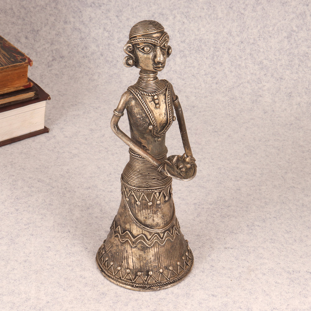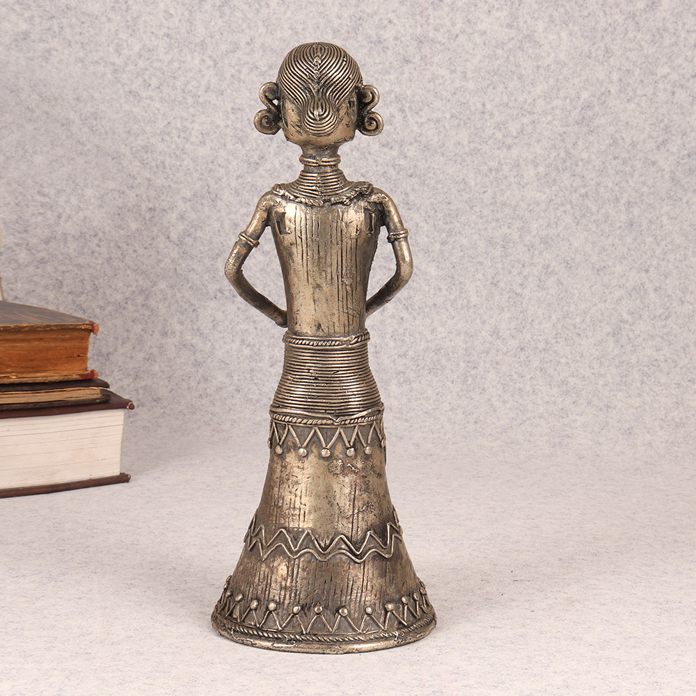 This stunning brass tribal lady statue is a true work of art, blending ancient cultural influences with a modern, sophisticated aesthetic. Crafted with exceptional attention to detail, every inch of this piece is adorned with mesmerizing tribal-inspired patterns and designs that instantly command attention. Whether displayed on a shelf, table, or mantel, this brass statue will elevate the style and ambiance of any space. The solid brass construction ensures exceptional durability, while the unique tribal motifs lend an exotic, worldly vibe that's perfect for infusing your home with global flair. This tribal goddess statue makes a captivating centerpiece or accent piece, elevating your décor while also serving as a stunning conversation starter. Invite the beauty and spirit of ancient tribal art into your living space, and transform any room into a warm, welcoming oasis infused with cultural richness.