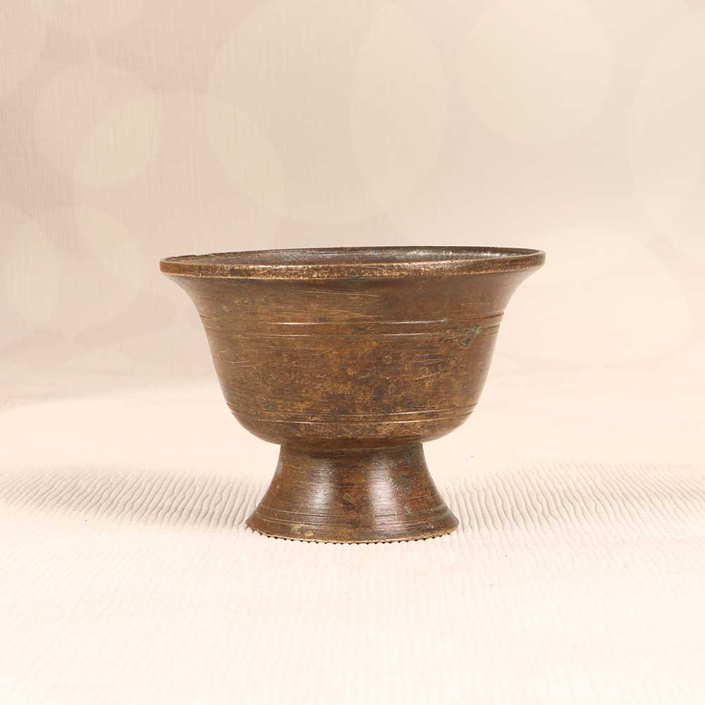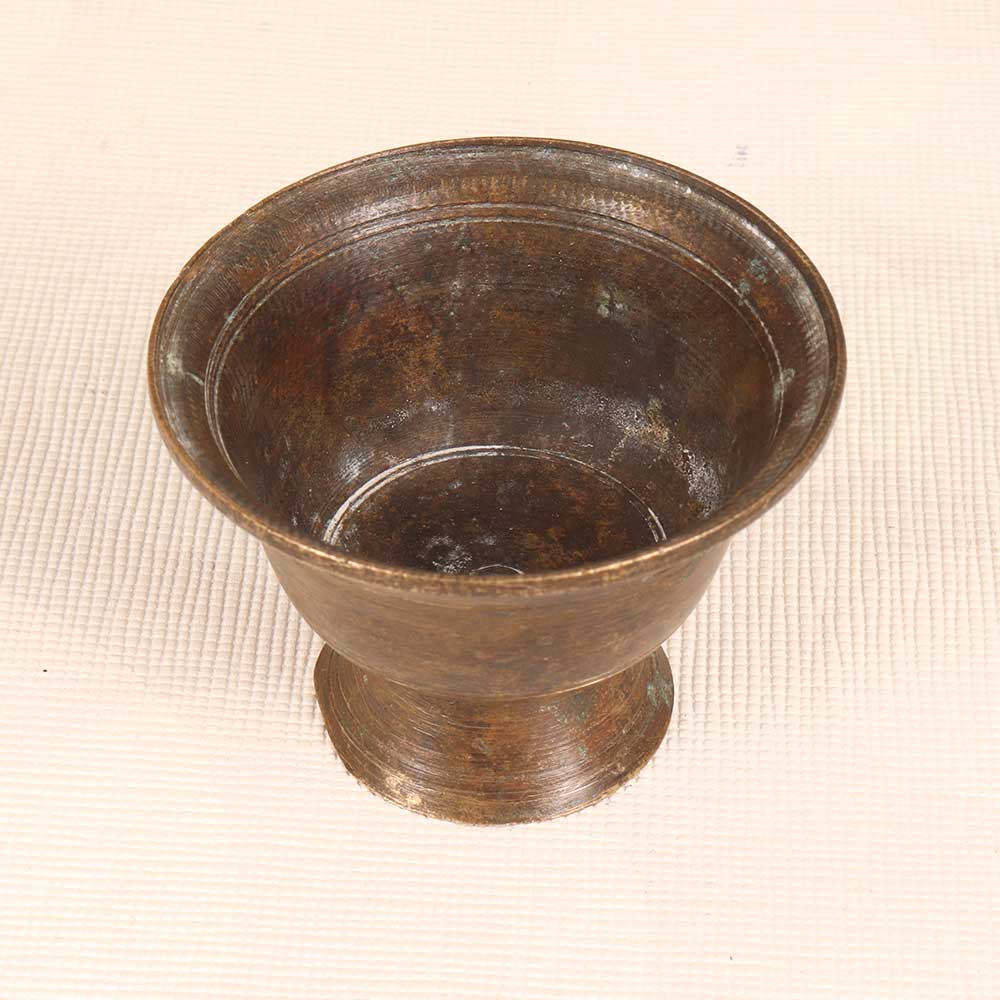 Elevate your prayer ritual with this vintage brass kumkum cup. Crafted from solid brass with delicate etchings, this cup adds a touch of timeless beauty to your puja. Adorned with traditional motifs, this kumkum cup is perfect for holding the vermilion powder used to make the bindi dot on the forehead. The cup allows you to scoop just the right amount of powder to mark your third eye chakra, bringing focus and intention to your practice. For devotees who cherish heritage and meaning in their puja, this brass cup makes a meaningful addition to your altar. Holding the cool metal, adorned with the symbols of your faith, you can connect more deeply to the ritual. Allow the heft of the solid brass to ground you and elevate your worship.