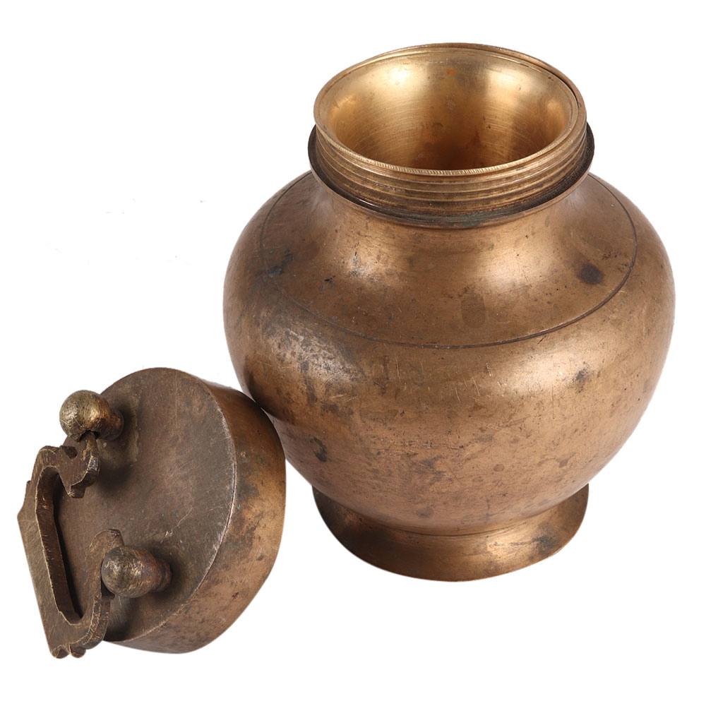 Shri Gangajal Kamandalu in Vintage Brass Craft with Loop Handle Lid - Spiritual Value or decorative Kamandalu is an oblong water pot used by Hindu hermits and buddhist monks to store drinking water or Gangajal. The kamandalu is typically portrayed in the hands of ascetic gods such as Shiva and Brahma.