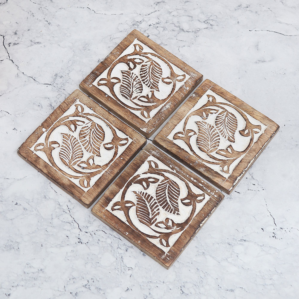 Buy a Pack of 4 wooden coasters online from our website that is the epitome of elegance and functionality. Handcrafted with utmost precision by highly skilled artisans from India, these wooden coaster sets are crafted from the finest quality wood, ensuring durability and longevity. Each coaster boasts a unique square shape, engraved with a beautiful brown and white leaf pattern, adding a touch of natural charm to any space. With its antique finish, these coasters double as striking decorative pieces that enhance the aesthetic appeal of your home or office. Not only do they serve as eye-catching accents, but they also fulfill a practical purpose. Designed to hold water, tea, juice, or coffee glasses, these coasters provide a protective barrier, preventing unsightly stains on surfaces. Versatile and suitable for various settings, whether it's at home, office, restaurant, hotel, or cafe, these best wooden coasters exude a sense of sophistication. Furthermore, they make exceptional gifts for your loved fours on special or festive occasions, showcasing your thoughtfulness and appreciation for their taste.