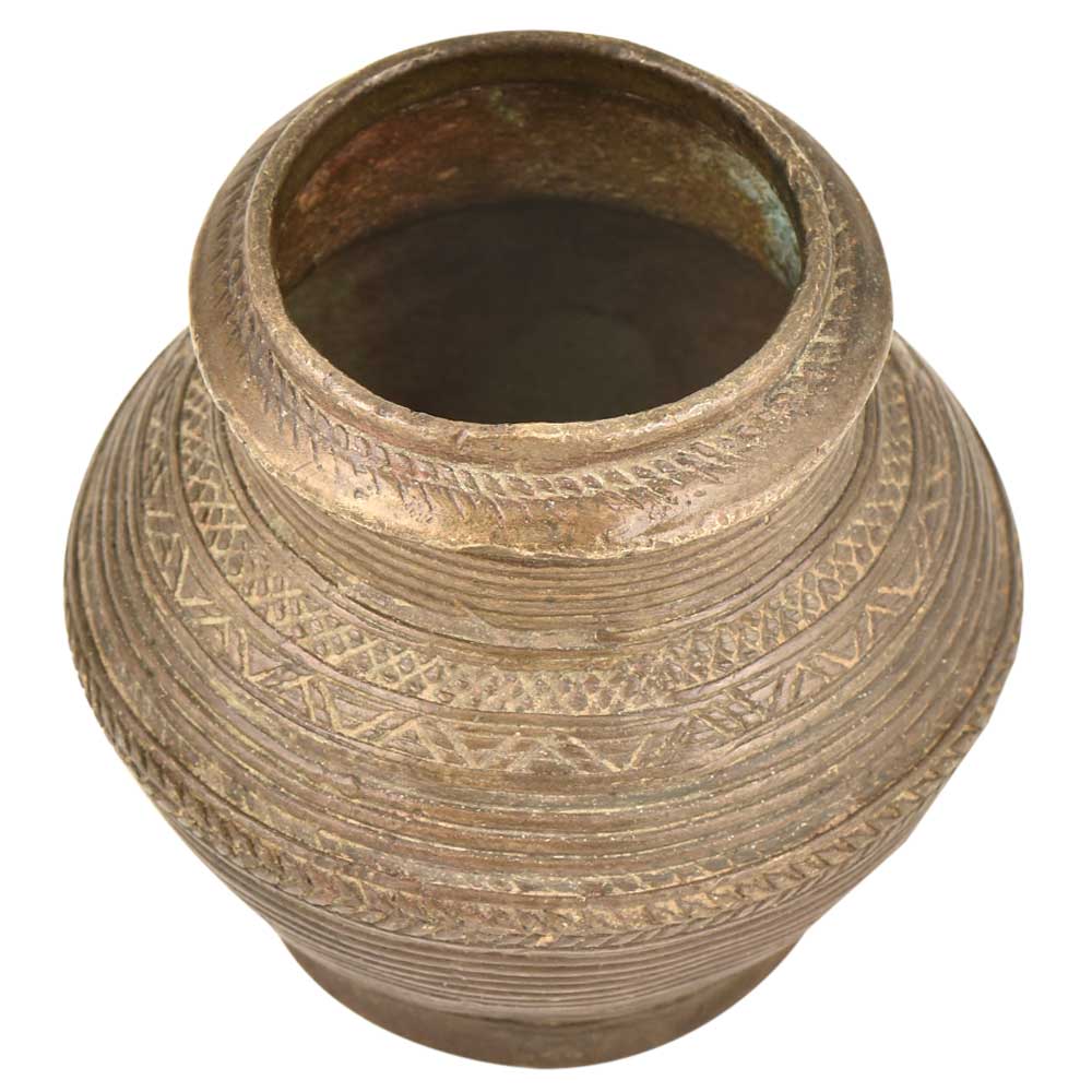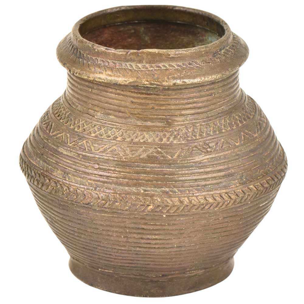 The intricately interwoven bands, ridges, and dimples mark this as a vessel of the tribal groups. The textural combinations and robust make it look very decorative and rustic. This Handmade Indian tribal water vessel is a particularly fine example of Indian tribal craftsmen.