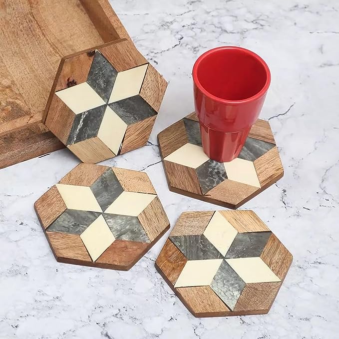 Buy wooden coasters online from our website which is meticulously crafted from high-quality wood and shaped into perfect squares. Each coaster in this set is a testament to the skill and artistry of highly skilled Indian artisans, who have poured their expertise into every intricate detail. The coaster's mesmerizing brown and white pattern, complemented by an antique finish, elevates it to the realm of a decorative masterpiece that adds a touch of elegance to any setting. Not merely ornamental, these coasters serve a practical purpose as well. They provide a sturdy and reliable base to hold water, tea, juice, or coffee glasses, ensuring the prevention of unsightly stains on surfaces. Whether it's your home, office, restaurant, hotel, or cafe, these coasters make for an essential accessory. Furthermore, this set of wooden coasters makes for a thoughtful and cherished gift for your loved ones on special or festive occasions. The combination of superb craftsmanship, timeless design, and functional utility makes it a perfect choice for those who appreciate beauty and practicality in equal measure.