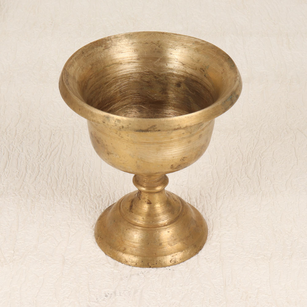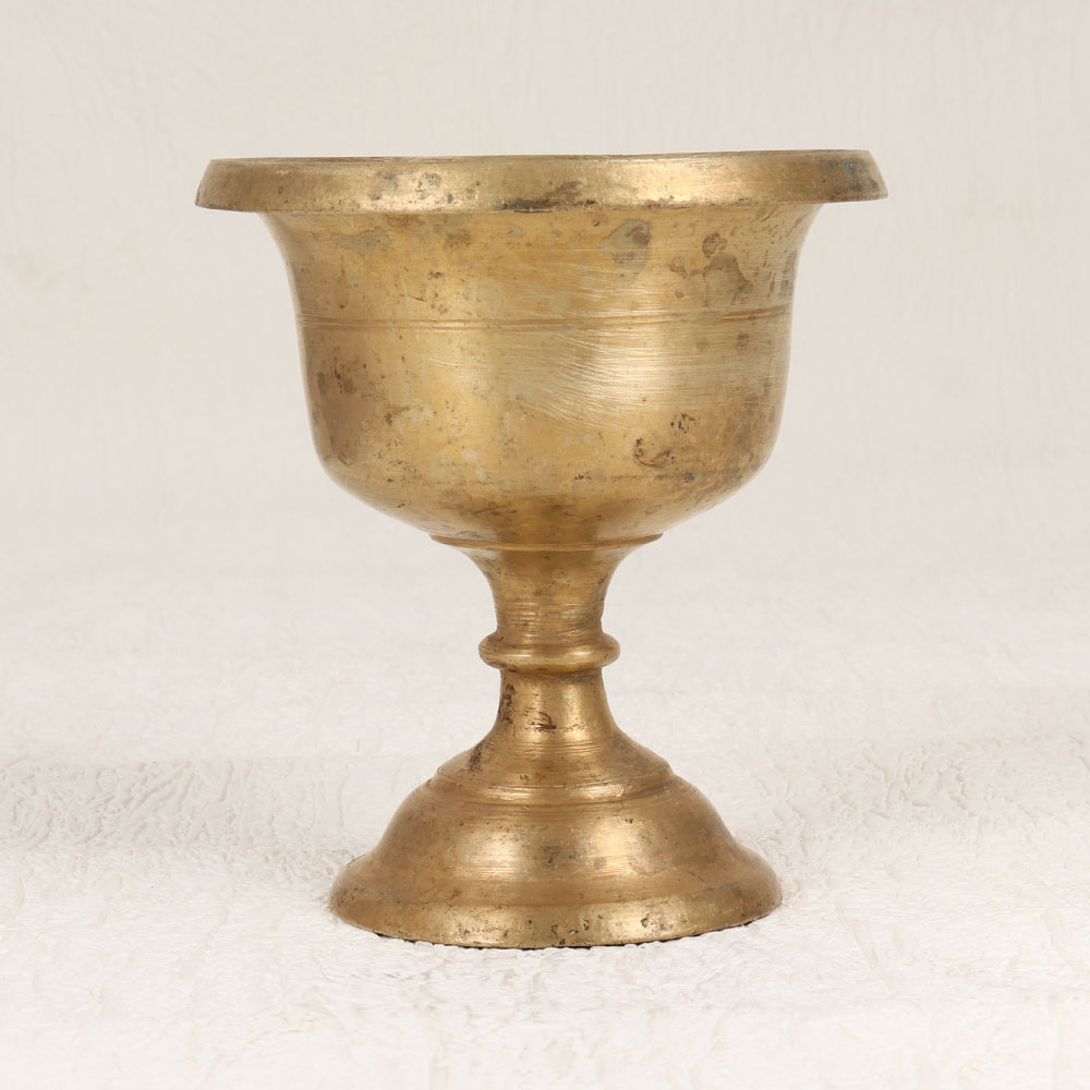 A Vintage Brass Kumkum Cup with Base Stand which is a timeless piece handcrafted by professional Indian artisans. This ceremonial accessory holds profound cultural significance, traditionally used during prayers, rituals, and havans to contain sacred kumkum tilak. Made from high-quality brass, its antique brown finish adds a touch of antiquity, reflecting the rich heritage of Indian craftsmanship. This ornate piece seamlessly blends functionality with aesthetics, making it a perfect addition to your home, office, restaurant, hotel, or cafe prayer room. Beyond its religious utility, this brass kumkum cup doubles as an elegant decorative item, lending an air of sophistication to any space. Its versatile design makes it an ideal choice for those seeking to enhance their vintage collection or to gift a cherished piece to your family, friends or relatives on special, festive, or auspicious occasions. Embrace the artistry and cultural resonance embodied in this handmade brass kumkum cup, a testament to the enduring craftsmanship and devotion of Indian artisans.
