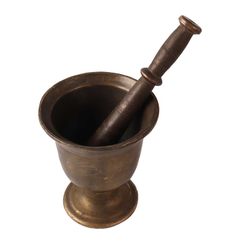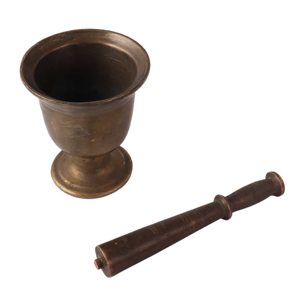 A Traditional Indian spice grinder or mortar and pestle or imam dasta made of high quality brass using ancient techniques in an antique finish. This urn shaped mortar has a stand at the bottom and an antique finish that will add an aesthetic touch to your home decor. Its unique design sets it apart from other pestles and grinders. It was used in Indian households to grind spices and by Ayurvedic and Unani doctors to make medicines. A decorative piece to enhance your home and office decor and a perfect collectible for your vintage collection.
