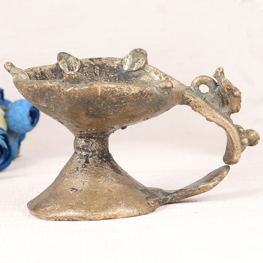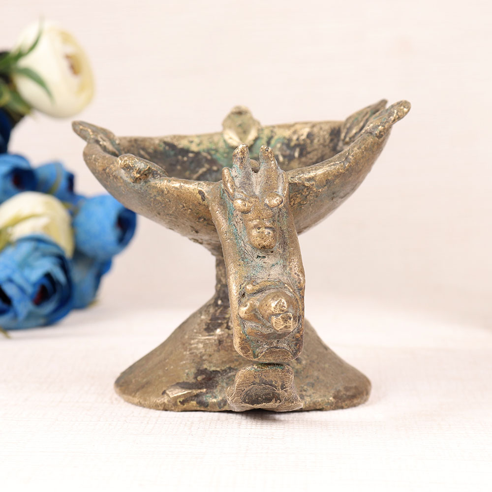 A Vintage Brass Aarti (Prayer) Lamp that is a testament to Indian craftsmanship and tradition. Handmade by highly skilled and experienced artisans from Western India, this piece is a true work of art. Crafted from high-quality brass, it boasts an antique brown finish that adds a touch of nostalgia to any space. This Aarti lamp with its distinctive cobra handle is not just a piece of décor, it's a symbol of devotion and spirituality. Place it in your home, office, restaurant, hotel, shop, or cafe's prayer room for morning and evening rituals. It’s warm, flickering glow creates a serene atmosphere that enhances your prayer experience. Vintage collectors will appreciate the authenticity of this piece, making it an excellent addition to any collection or exhibition. The lamp can lit up to five lights, allowing you to illuminate your space with the soothing radiance of mustard oil or ghee using cotton wicks. Gift your family, friends or relatives this unique Aarti lamp on special, festive, or auspicious occasions, and share the timeless beauty and spirituality of Indian culture.