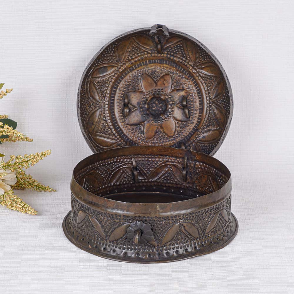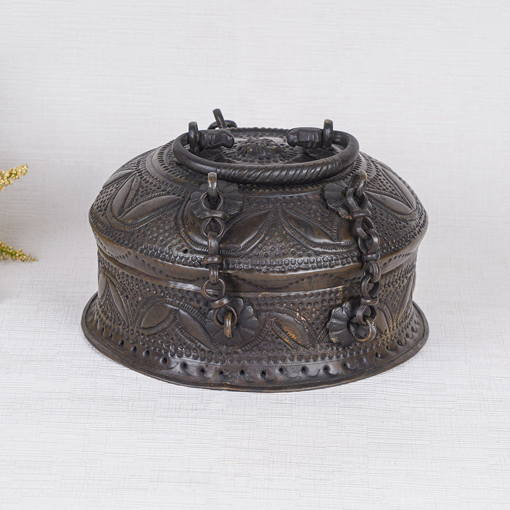 Buy a brass jewelry box online that is made by skilled Indian artisans with their hands. This luxurious piece showcases breath-taking engraved designs and features a captivating dark brown finish, making it a truly eye-catching addition to any space. The jewelry box is not only a practical storage solution for your precious gems and jewelry but also doubles as a stunning decorative item for your home or office. Designed with convenience in mind, this jewelry box is equipped with a sturdy handle on the top, allowing for easy transport and handling. Its antique finish adds a touch of elegance and sophistication to any room. The secure latch ensures the safety of your valuable possessions. This exceptional piece is not only ideal for personal use but also serves as a marvellous display item at museums or exhibitions, captivating the attention of customers with its intricate craftsmanship. An extraordinary gift for your loved ones on special or festive occasions, expressing your thoughtfulness and appreciation. Experience the allure of our brown luxury jewelry box, combining style, functionality, and timeless beauty in one remarkable creation.