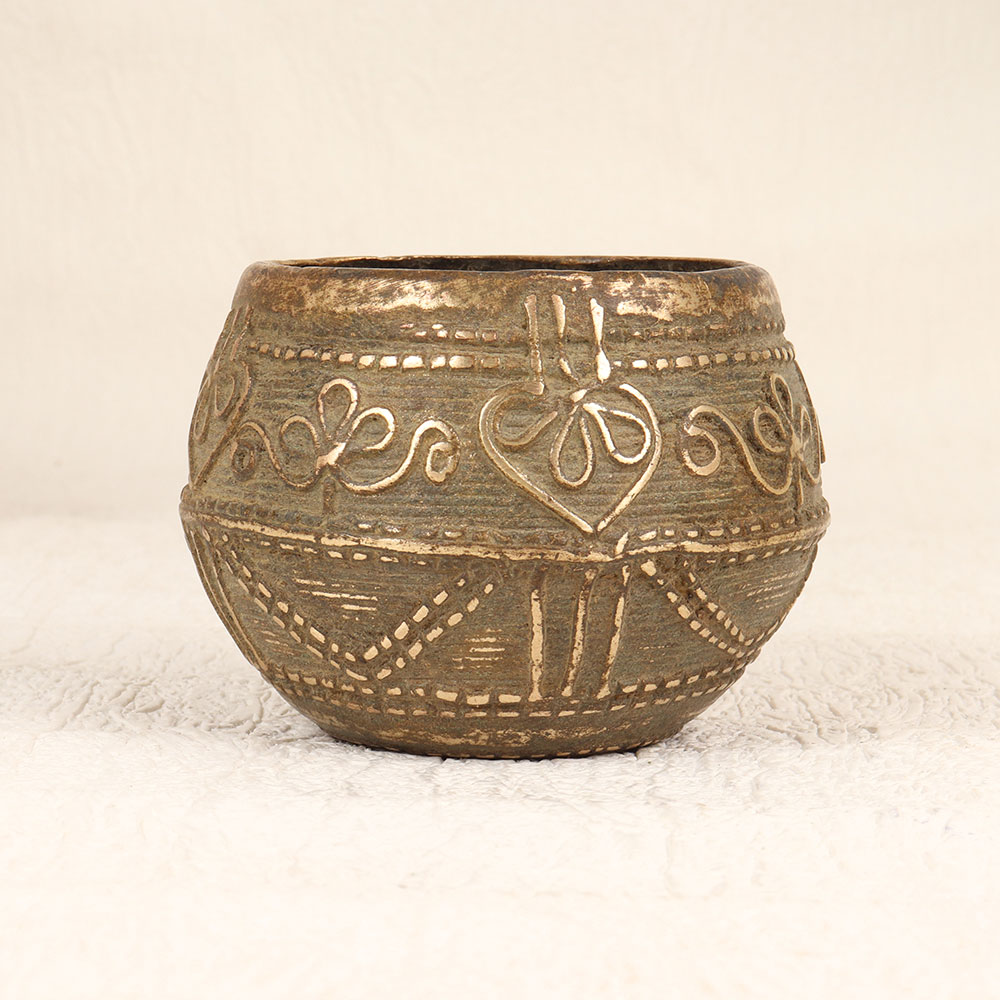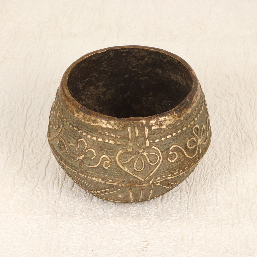 A Vintage Brass Rice Measurement Bowl which is a timeless piece meticulously crafted by skilled Indian artisans from the culturally rich region of Odisha. This unique bowl not only showcases the craftsmanship of these artisans but also embodies the rich heritage of India. Made from high-quality brass, the bowl features intricate engravings that tell a story of tradition and artistry. The antique brown finish adds a touch of elegance, giving it a distinguished and nostalgic appearance. Handmade with precision, this vintage bowl serves as a captivating decorative item suitable for various settings – be it at home, in the office, a restaurant, hotel, or cafe. Its versatile design allows it to seamlessly blend into any environment, enhancing the aesthetic appeal of the space. However, due to its vintage nature, we recommend using this bowl exclusively for decoration purposes. It makes for a remarkable addition to any vintage collection, showcasing a piece of history in a contemporary setting. Moreover, this meticulously crafted brass bowl is an ideal and thoughtful gift for your loved ones on special, festive, or auspicious occasions, creating a connection between the past and the present.