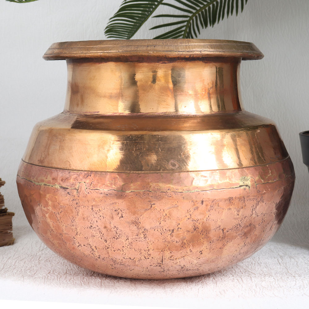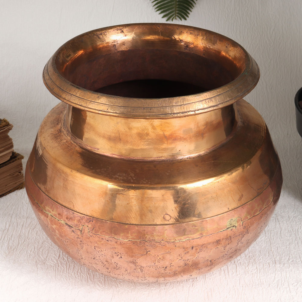Buy a vintage copper cooking pot online in an exquisite antique golden finish and get a hassle free delivery right at your doorstep. Handcrafted by highly skilled Indian artisans with a passion for preserving tradition, this culinary artefact is the epitome of artistry and functionality. Crafted from high-quality copper, it exudes an aura of nostalgia, reminding us of the rich culinary heritage of India. This vintage copper pot is a versatile addition to any space, be it your home, office, restaurant, hotel, cafe, or shop. Its shimmering golden finish adds a touch of elegance to any decor. While it may no longer serve its original cooking purpose, we recommend using it for decoration or as a unique flower pot, infusing charm into your surroundings. This piece is a vintage gem, best suited for display in your vintage collection or as an eye-catching exhibit in an art or antique exhibition. It also makes for a thoughtful gift for your family, friends or relatives on special, festive, or auspicious occasions, carrying with it the legacy of craftsmanship and tradition that is sure to be cherished for generations to come.