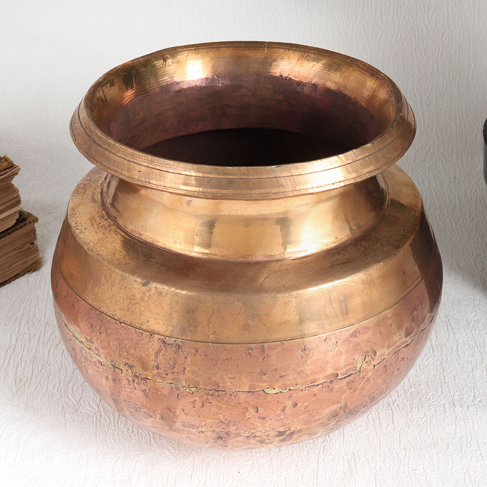 Buy a Vintage Copper Cooking Pot online that is a true masterpiece crafted by skilled Indian craftsmen. This stunning piece boasts a lustrous antique golden finish, showcasing the timeless beauty of high-quality copper. Handmade with precision and care, this pot reflects the rich craftsmanship of Indian artisans. Its versatile design allows it to adorn various settings, whether it's your home, office, restaurant, hotel, cafe, or shop. You can use it as an elegant decorative item or repurpose it as a charming flower pot. As a vintage treasure, we recommend using it primarily for decoration to preserve its unique charm. This pot serves as a remarkable addition to your vintage collection or can be proudly displayed at exhibitions, captivating onlookers with its aesthetic appeal and historical significance. Consider gifting this Vintage Copper Cooking Pot to your family, friends or relatives on special, festive, or auspicious occasions. It's not just a gift, it's a piece of art that carries the heritage and craftsmanship of India, sure to be cherished for generations to come.