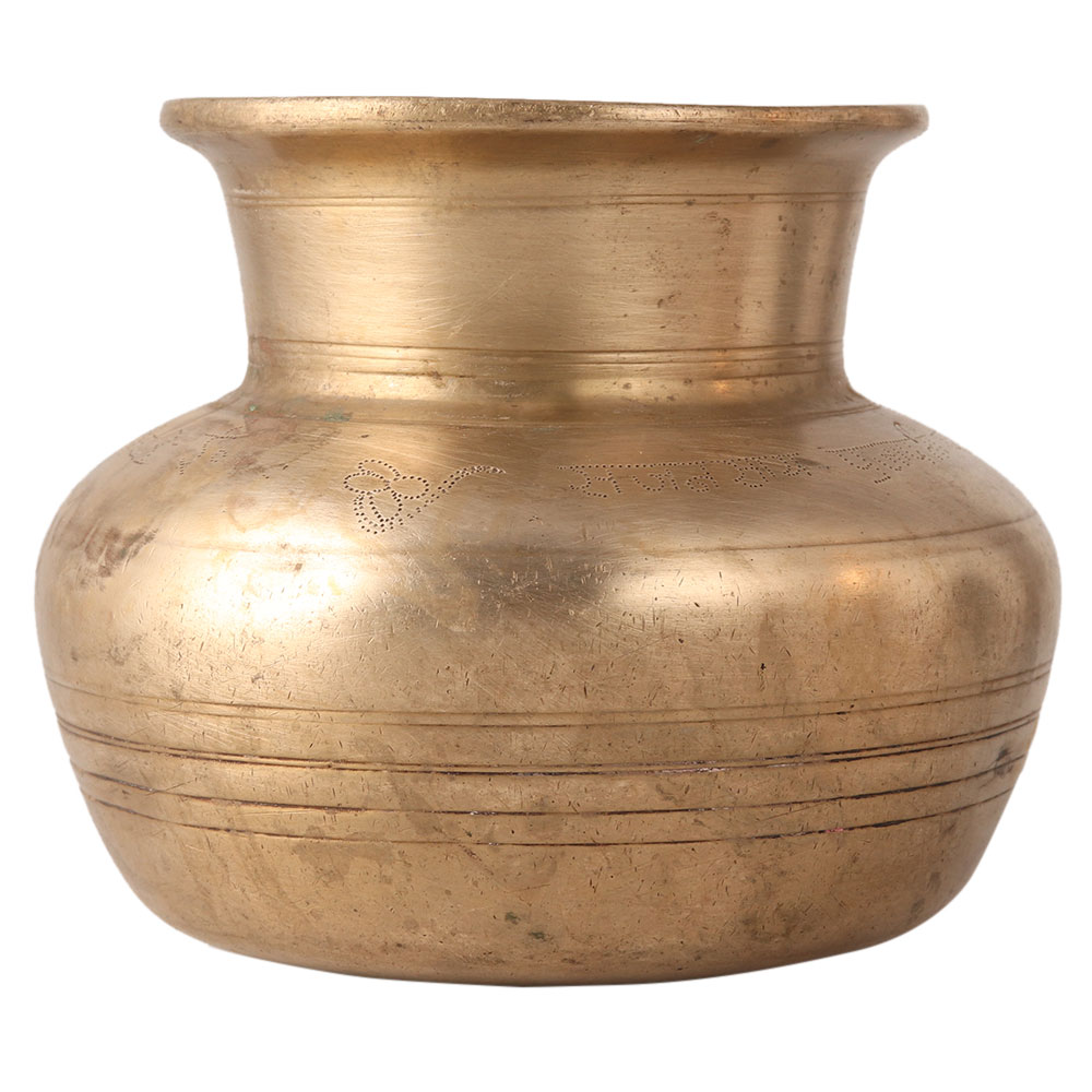 Vintage style Indian Kalash is made of white metal alloy is made of white metal alloy. It has a line pattern on the sides. A Kalash is a vessel that has a narrow opening with a large belly to hold sacred water, rice, gold coins, flowers or gems. Placing the Kalash in the north or east of a room with sacred water will increase positive energy in your home.