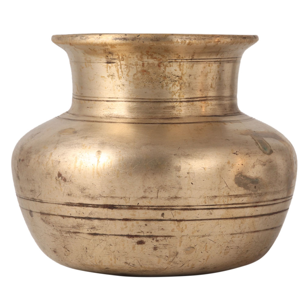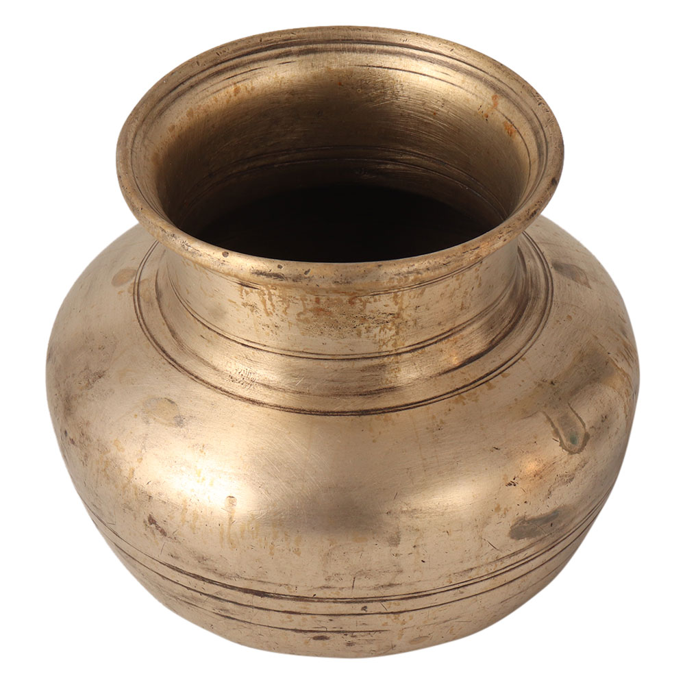 This vintage Indian Lota water pot is carved from a white metal alloy. It has a simple design with bold circular rings that go past the neck and belly. With its simple design, it looks sturdy. It has a slightly curved bottom to hold on the surface. You can use it in Hindu rituals. You can also use it to decorate your home.