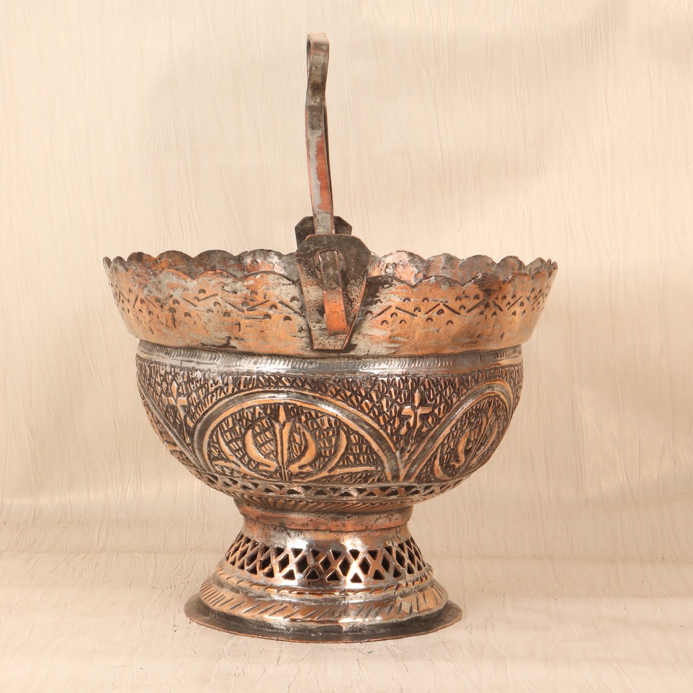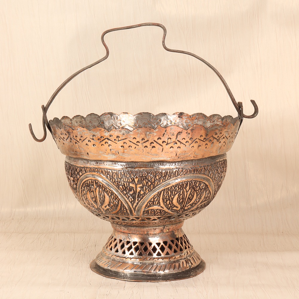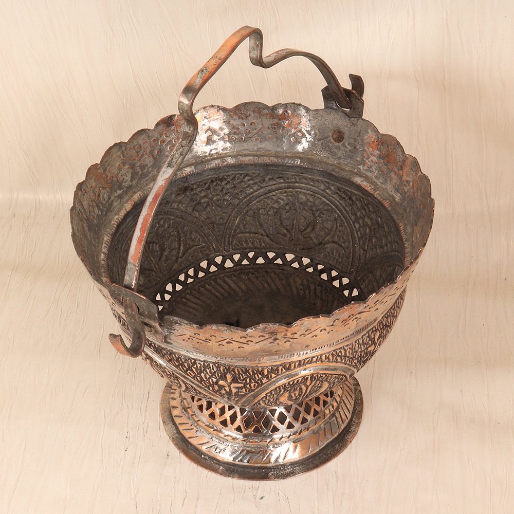 Unlock the timeless beauty of Islamic art with this exquisite vintage copper bucket. Crafted with meticulous attention to detail, this piece is a true testament to the rich cultural heritage that has inspired artisans for centuries. Imagine the warm, inviting glow of the copper, casting a soft light that enhances the mesmerizing patterns that adorn its surface. This vintage copper bucket is more than just a decorative piece – it's a work of art that will instantly elevate the ambiance of any room. Whether you're a collector of Islamic art, a lover of unique home decor, or simply seeking to infuse your space with a touch of cultural elegance, this copper bucket is the perfect addition. Display it proudly on a mantel, side table, or bookshelf, and let it become a captivating focal point that sparks conversations and inspires awe. Embrace the allure of Islamic artistry and transform your home with this stunning vintage copper bucket. It's a piece that will not only captivate your guests but also serve as a constant reminder of the timeless beauty and craftsmanship that has defined the Middle East for generations. Elevate your space and immerse yourself in the captivating world of Islamic art with this exceptional addition to your home.