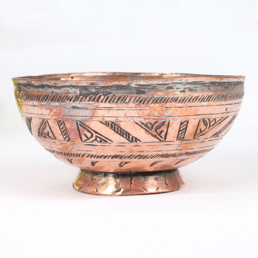 Decorate your living room with the timeless allure of our vintage Copper Bowl that is a masterpiece crafted by talented artisans in Islamic Art. This bowl boasts an enchanting antique brown finish, showcasing the rich patina that only time can bestow. Intricately engraved with meticulous detail, each stroke reflects the artistry of its creators, creating a stunning visual tapestry that tells a story of tradition and craftsmanship. Handmade from high-quality copper, this bowl transcends mere décor, it's a testament to the enduring beauty of artisanal skill. Versatile in its application, the bowl seamlessly integrates into various settings, be it at home, office, restaurant, hotel, or cafe. Use it as a captivating decorative piece or repurpose it as an indoor flower pot, infusing nature with the grace of vintage aesthetics. An ideal addition to any vintage collection, this copper bowl is more than an object; it's a statement of refined taste and appreciation for heritage. Consider it a thoughtful gift for your family, friends or relatives on special, festive, or auspicious occasions.