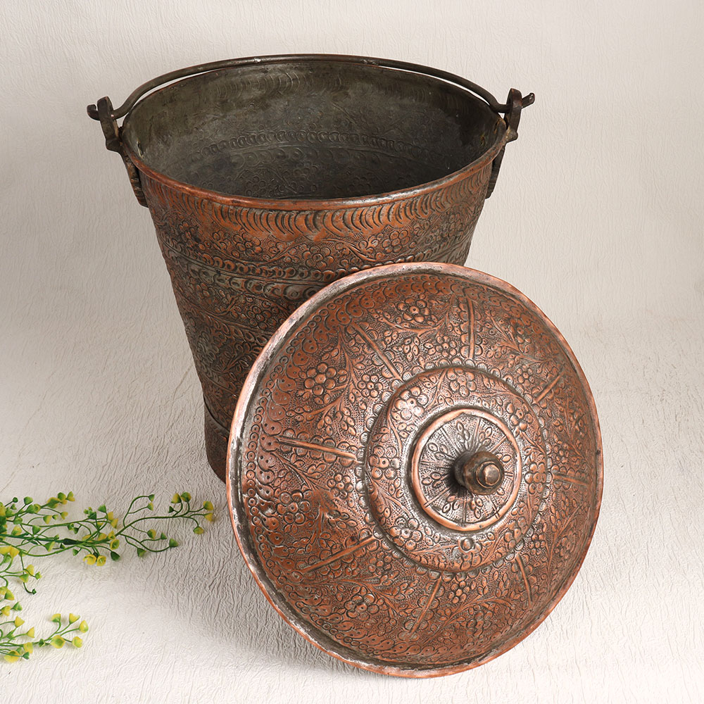 Enhance your interior decor with the timeless charm of our Vintage Copper Bucket with Engraving. This piece is crafted by highly skilled artisans in the tradition of Islamic Art and boasts exceptional craftsmanship. Made from high-quality copper, it showcases an antique brown finish that lends it an authentic vintage appeal. With its enchanting engravings and ornate lid, this copper bucket is a testament to the intricate artistry of its makers. Its sturdy handle adds to its functionality, making it a versatile piece that can adorn various settings. While it can be a stunning addition to your home, office, restaurant, hotel, cafe, or shop, we recommend using it primarily for decorative purposes due to its vintage nature. This piece is perfect as a flower pot, adding an air of sophistication to your floral arrangements. Furthermore, this vintage copper bucket is an excellent addition to your vintage collection or as an eye-catching display at exhibitions. It's also a thoughtful gift for your family, friends or relatives on special, festive, or auspicious occasions, symbolizing tradition, artistry, and elegance.