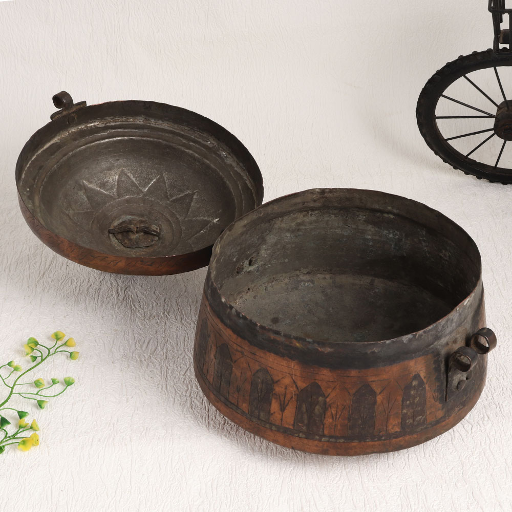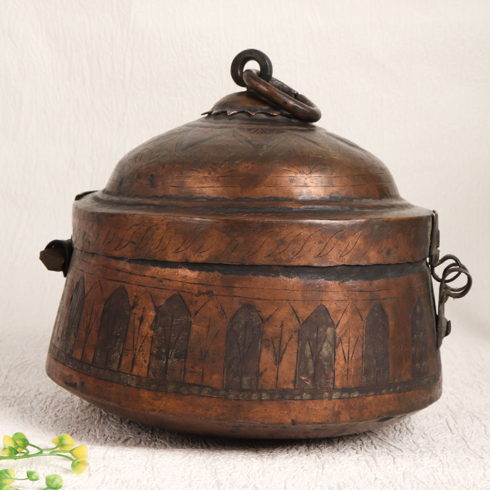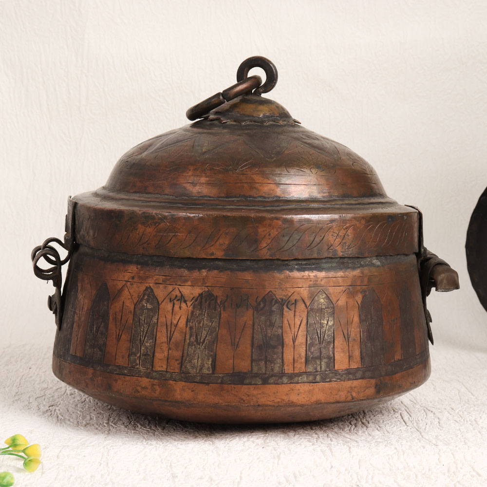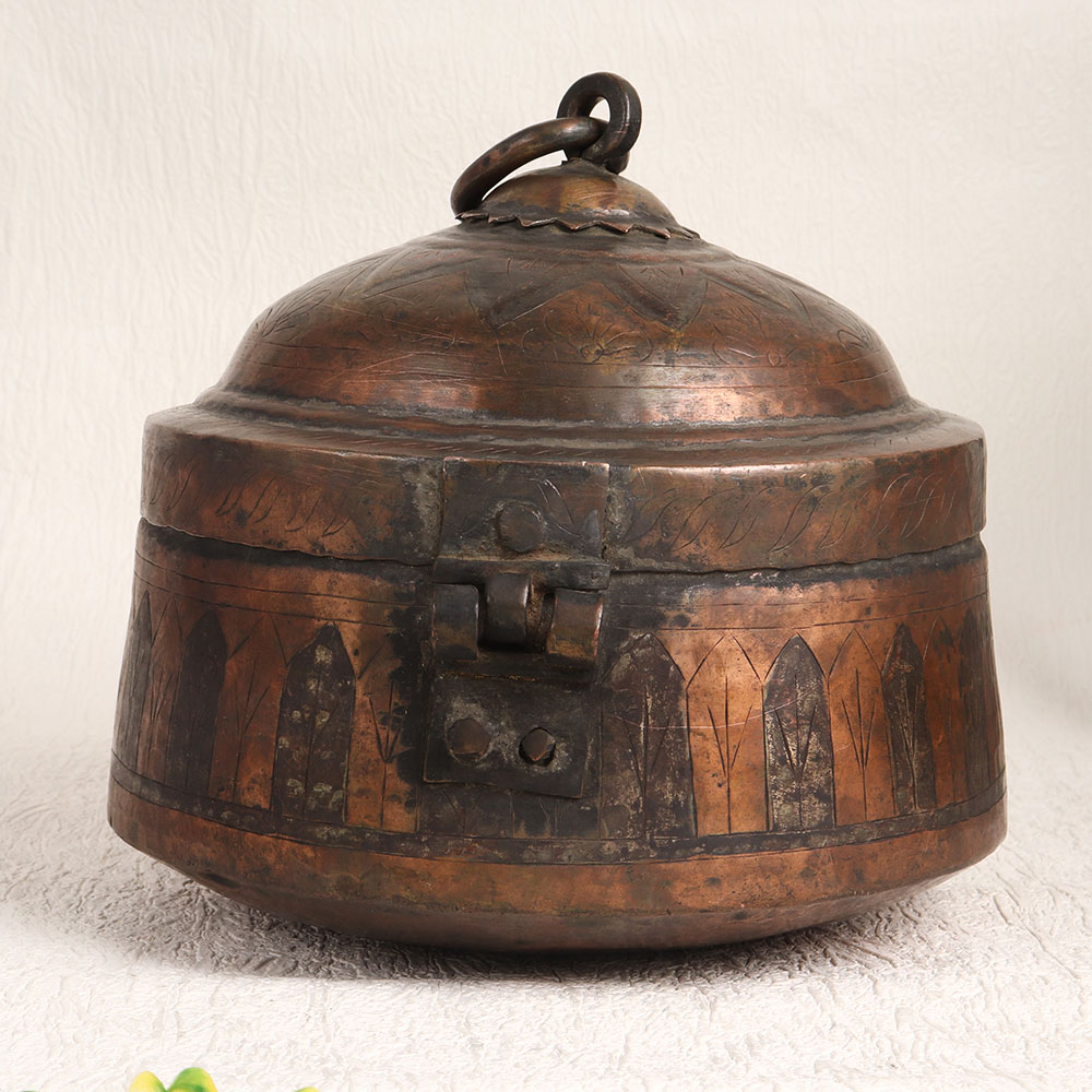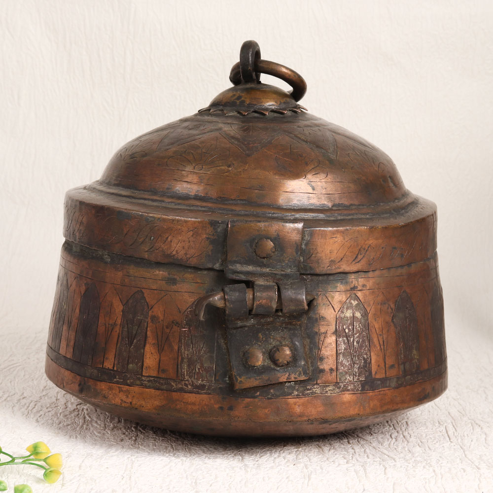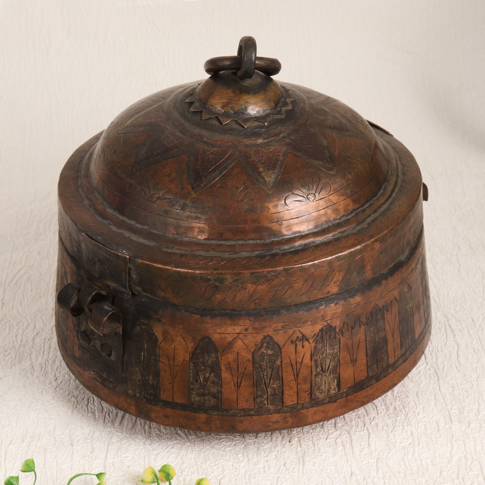 Adorn your decor with the timeless allure of our Vintage Copper Islamic Jewelry Box. Crafted with exquisite detail by highly skilled Indian craftsmen from Hyderabad, this stunning piece showcases the rich heritage of Islamic craftsmanship. The box features intricate carvings that pay homage to traditional Islamic design, adding an element of elegance and cultural significance to any space. Its antique brown finish exudes a warm and rustic charm, further enhancing its vintage appeal. The lid boasts a beautifully crafted ring handle, allowing for easy access to the treasures stored within. Handmade from high-quality copper, this jewelry box not only serves as a decorative masterpiece but also provides a secure and stylish sanctuary for precious stones, gems, or jewelry. Versatile in its utility, this box is suitable for various settings, including homes, offices, restaurants, hotels, cafes, or shops, making it a versatile addition to your decor collection. Whether displayed at an exhibition, or given as a thoughtful gift on special, festive, or auspicious occasions, this Vintage Copper Islamic Jewelry Box is a symbol of artistry, culture, and sophistication.