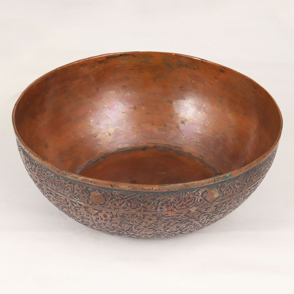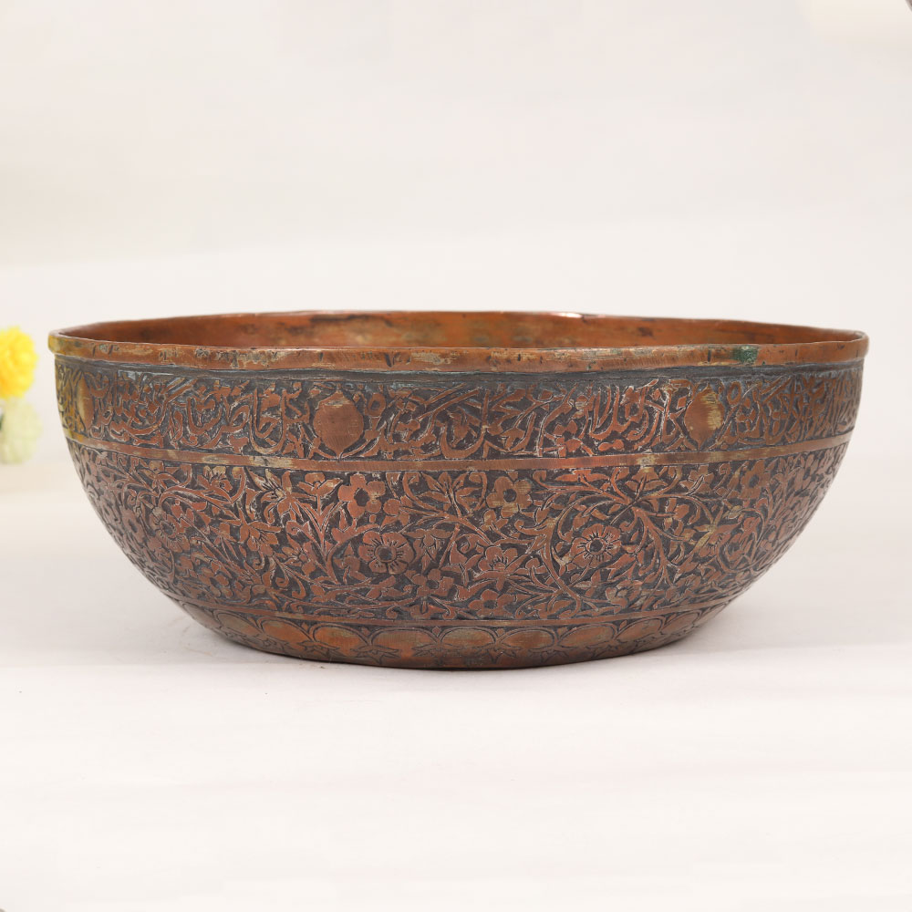 A Vintage Copper Islamic Bowl which is a masterpiece crafted by highly talented artisans in Persian Art. Handmade from high-quality copper, this bowl showcases intricate engravings that tell a story of the rich cultural heritage and craftsmanship of the Persian tradition. The antique brown finish lends an air of authenticity and nostalgia, making it a perfect addition to any space. Versatile and elegant, this bowl transcends mere decoration. Whether adorning the shelves of your home, enhancing the ambiance of your office, gracing the tables of a restaurant or hotel, or adding a touch of sophistication to a cafe, its allure is undeniable. Embrace its multi-functional appeal by transforming it into an indoor flower pot, bringing nature's beauty indoors with a touch of historic grandeur. This vintage masterpiece is not just an ornament but a testament to a bygone era. A perfect addition to any vintage collection, this Copper Islamic Bowl also makes for a thoughtful and meaningful gift for your family, friends or relatives on special, festive, or auspicious occasions.
