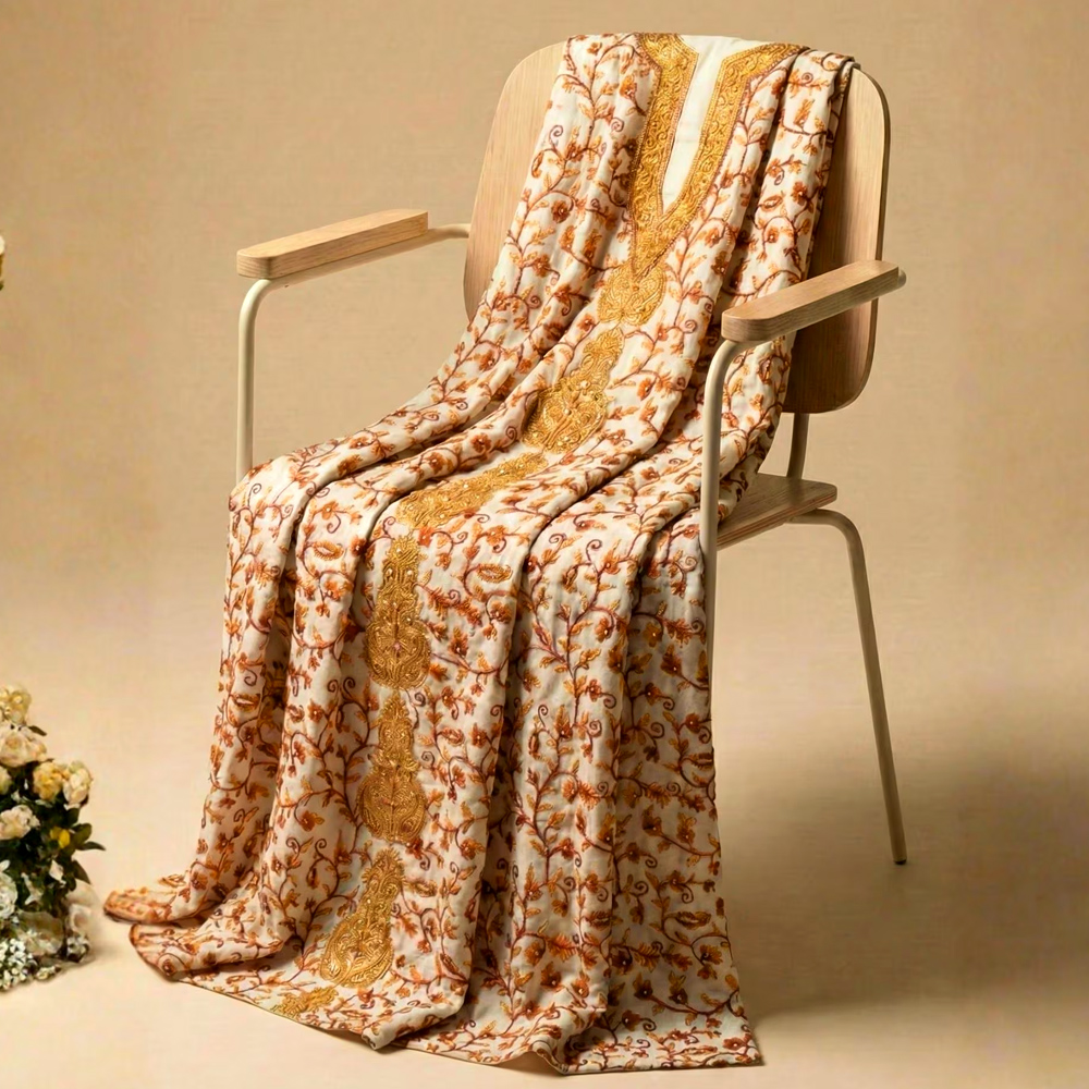 Celebrate timeless Kashmiri craftsmanship with this hand-embroidered cottonviscose kurta, designed to balance elegance and everyday comfort. The soft ivory base is adorned with flowing vine motifs and intricate golden embroidery, creating a refined surface that feels rich yet wearable. Light, breathable, and fluid in drape, this kurta transitions effortlessly from daytime gatherings to intimate festive occasions.