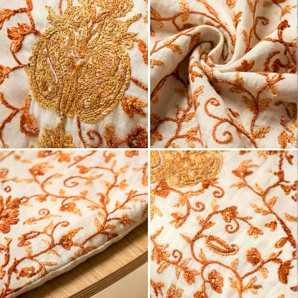 - Hand-embroidered vine motifs inspired by classic Kashmiri textile traditions